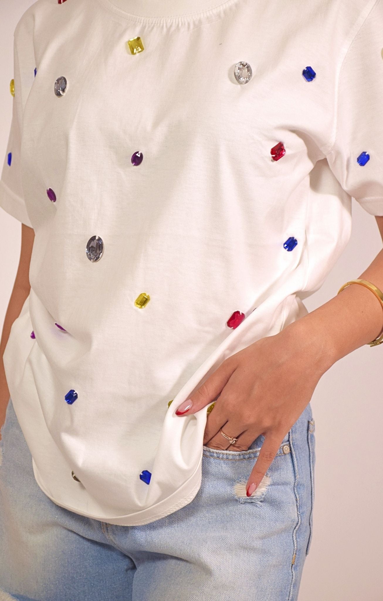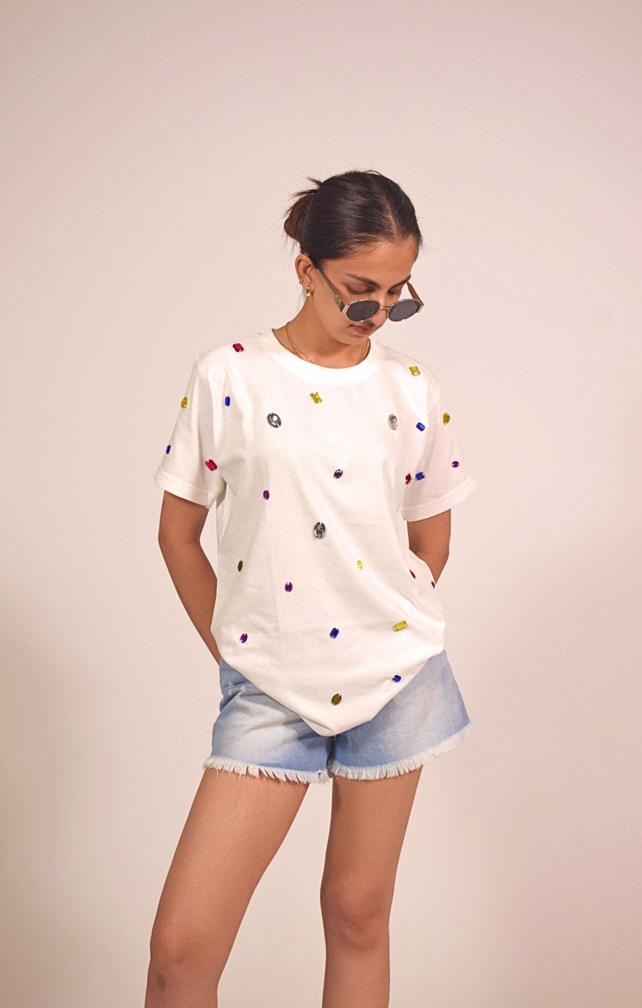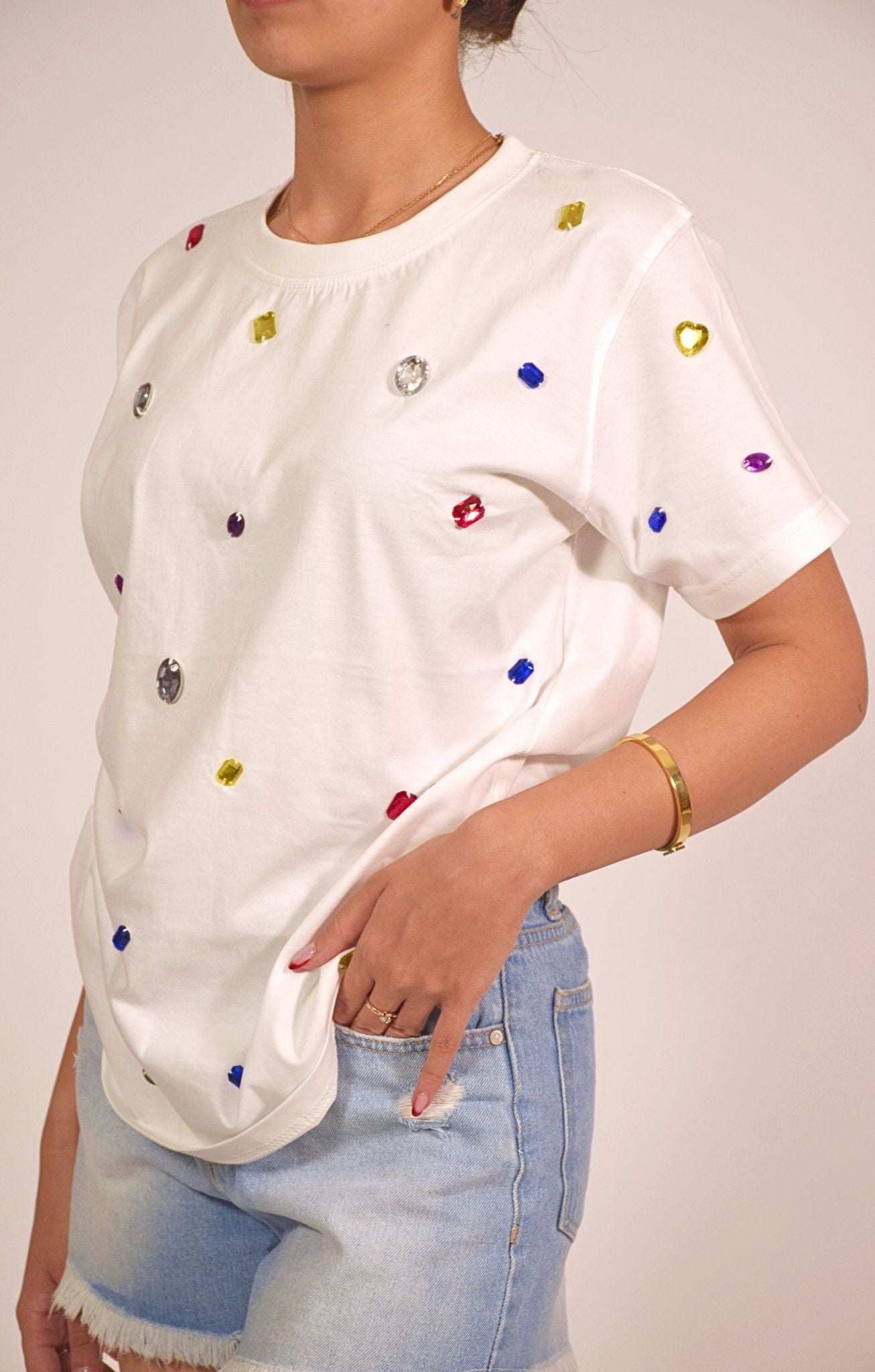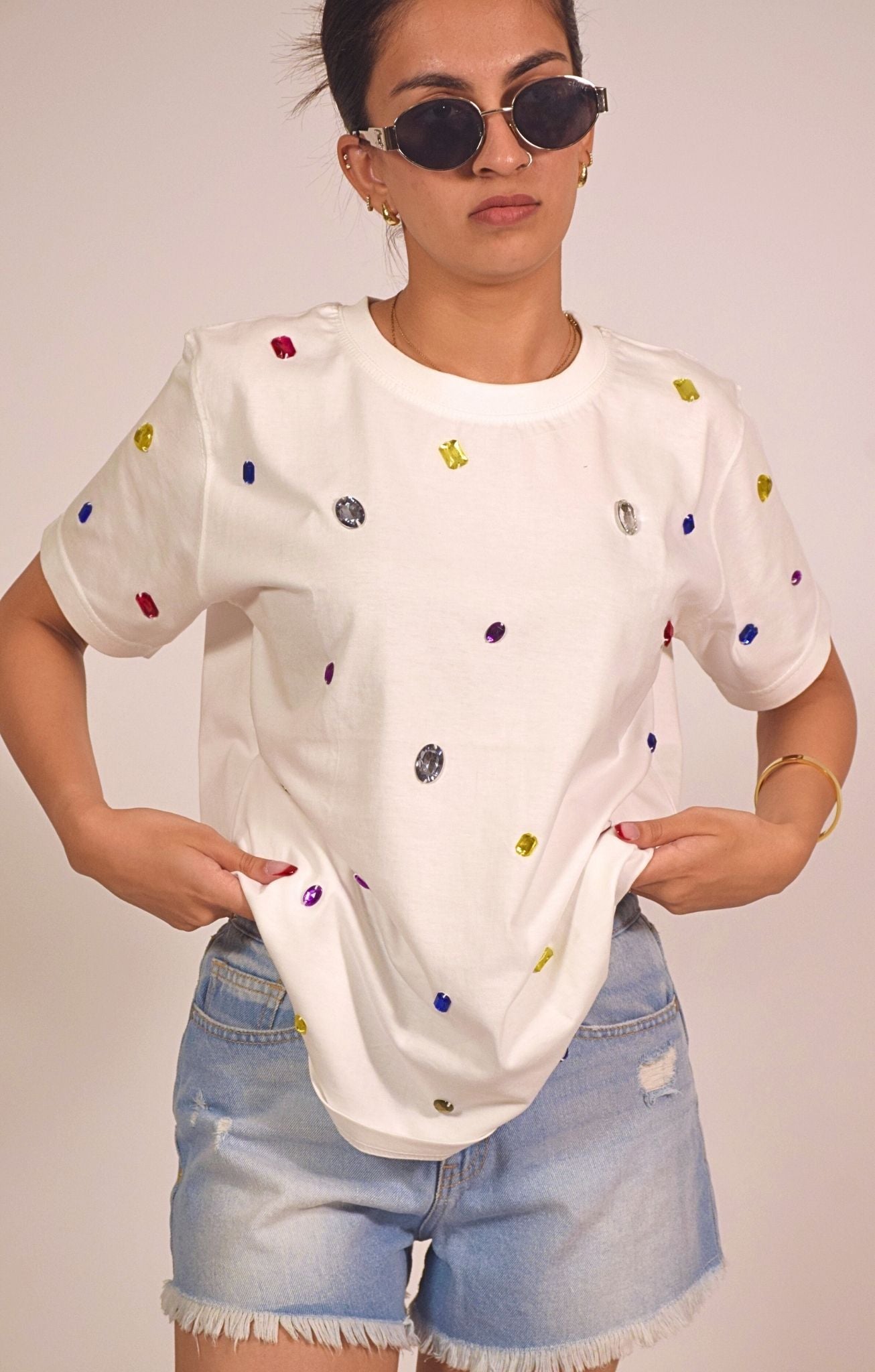 Add a pop of playful glam to your everyday wardrobe with this embellished white t-shirt. Made from soft, breathable cotton, the relaxed-fit tee is adorned with scattered multicolored gem-like studs that create a sparkling confetti effect. It's a fun and eye-catching piece that brings life to even the simplest outfit, making it a must-have for those who love to shine without trying too hard.
