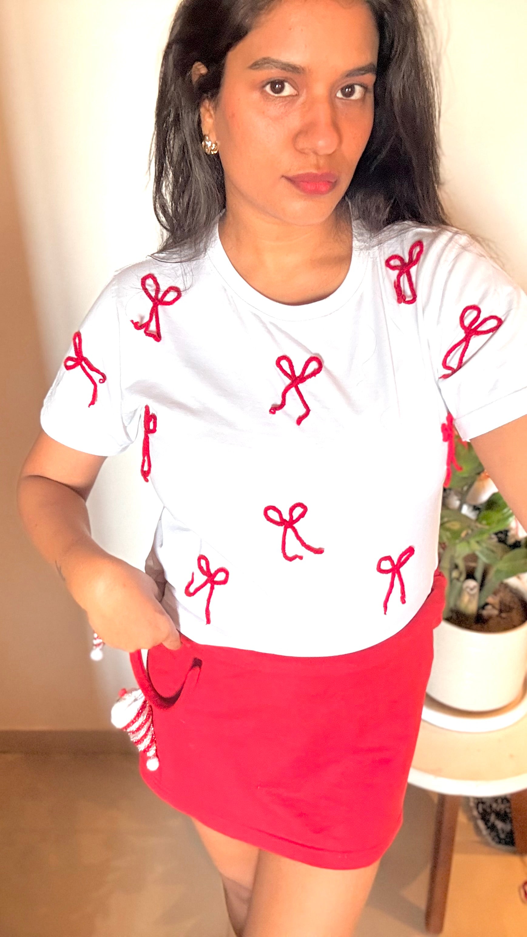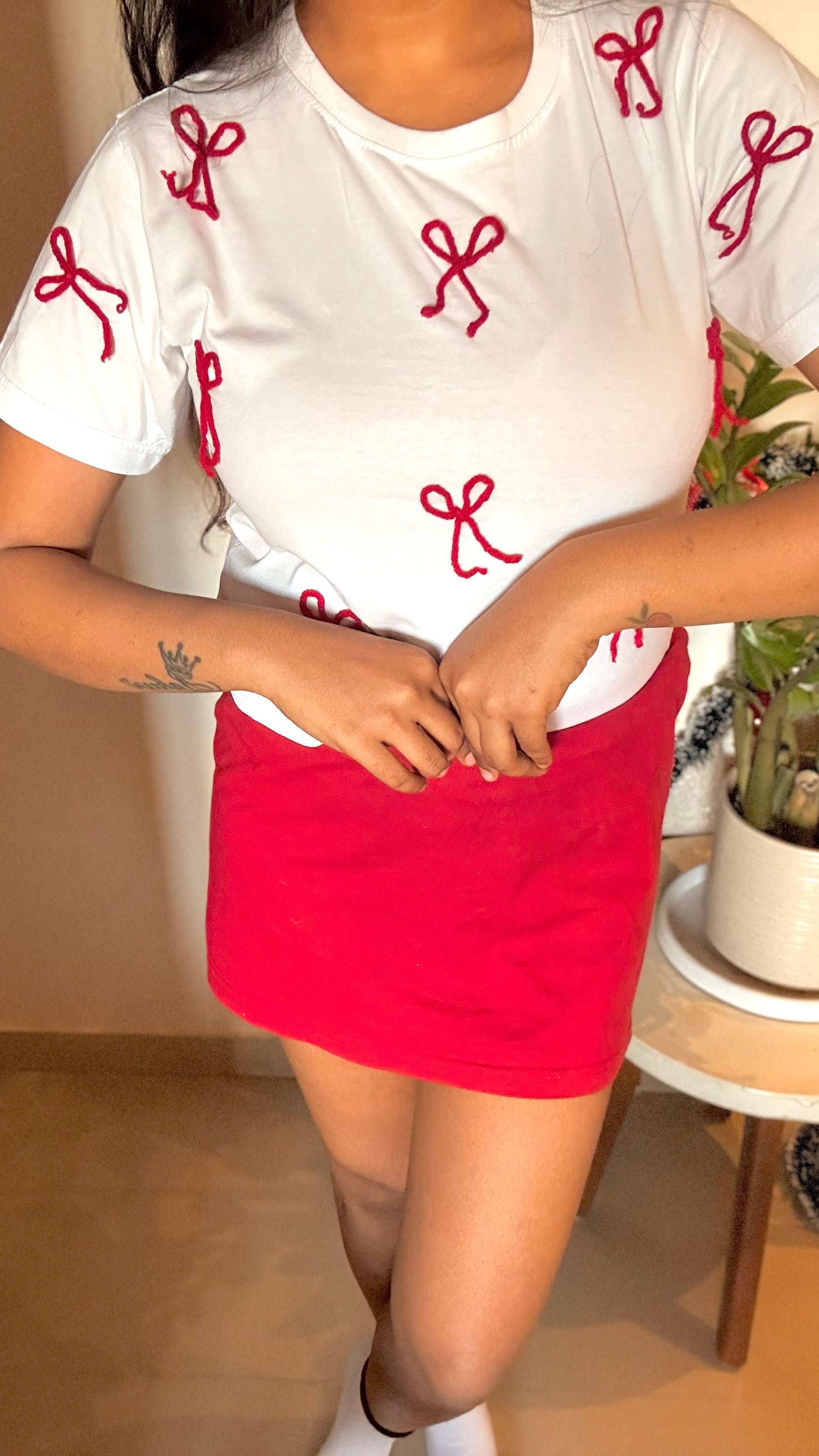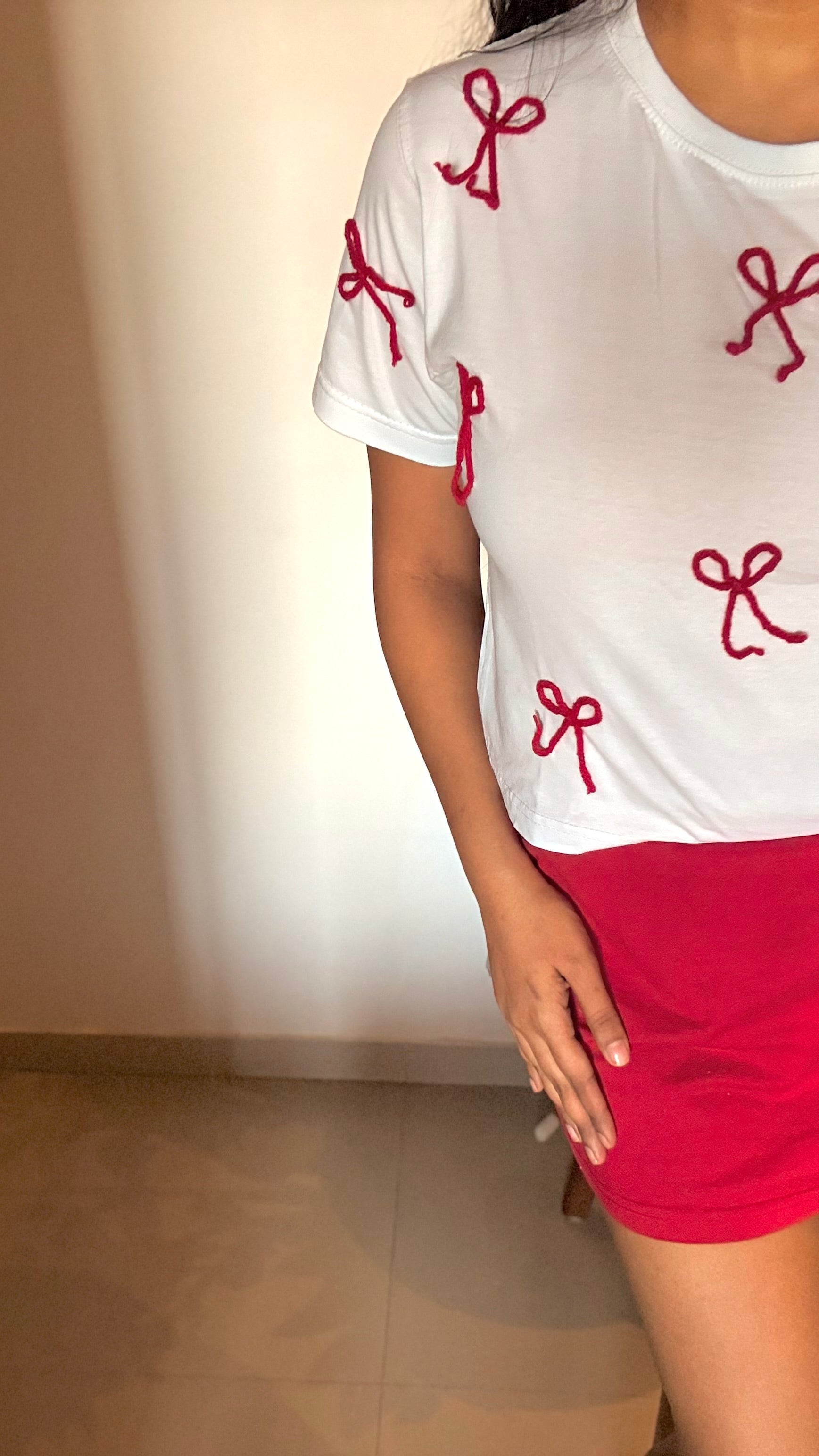 Effortlessly charming and breezy, this white t-shirt features delicate 3D crochet bows appliqués embellished adding a soft, feminine flair to your everyday look. Made from lightweight, breathable cotton, it offers all-day comfort with an elevated twist. Whether you're heading out for brunch or strolling by the beach, this tee brings understated elegance to casualwear.