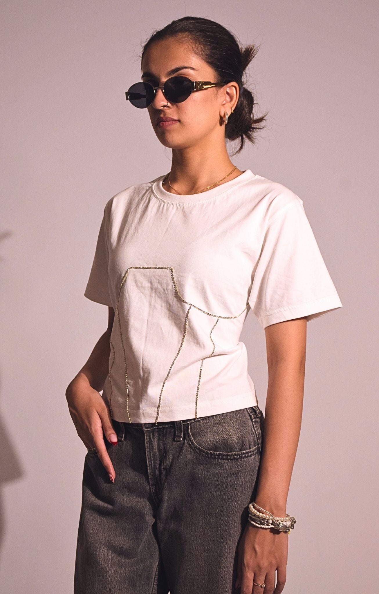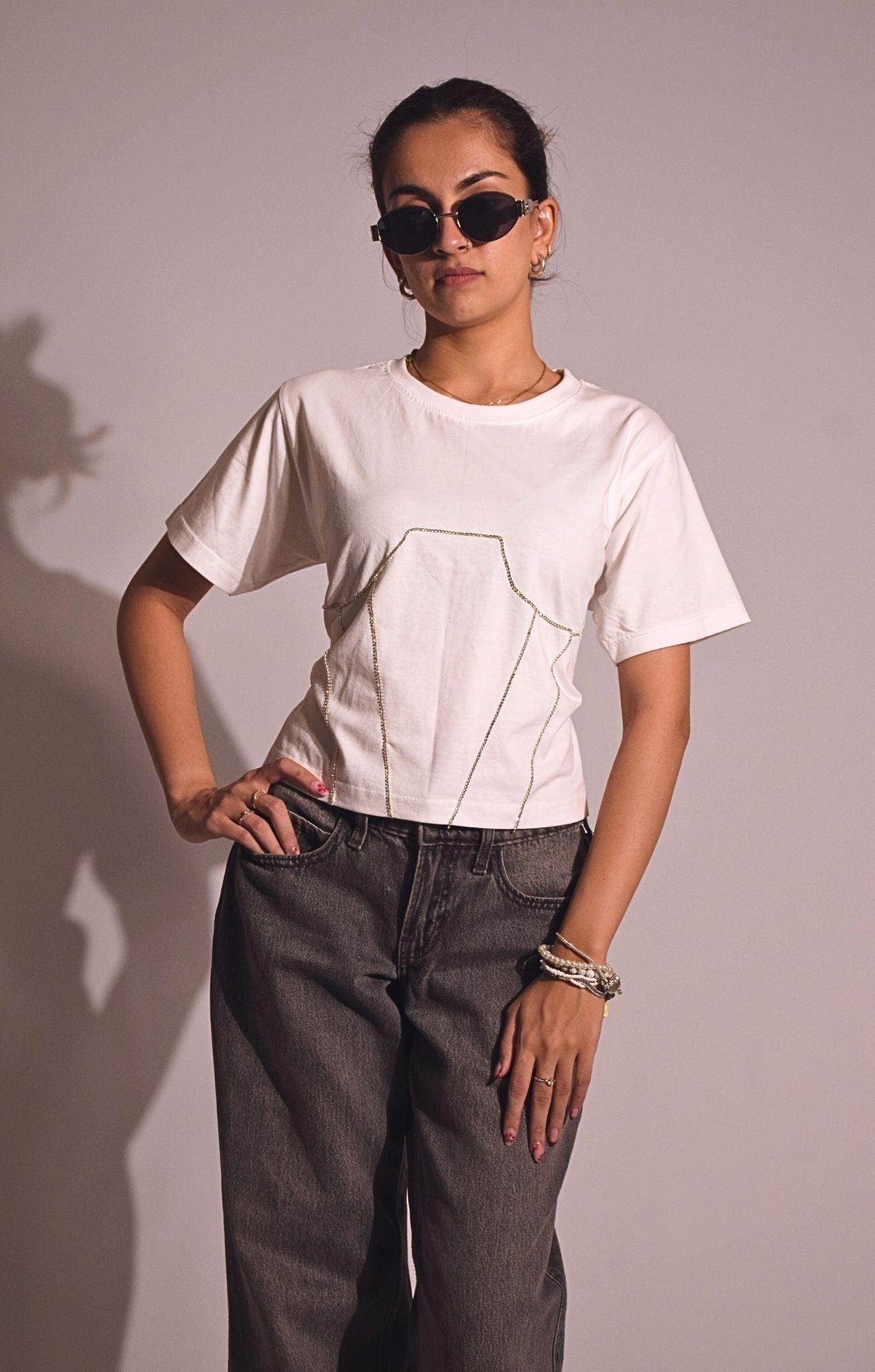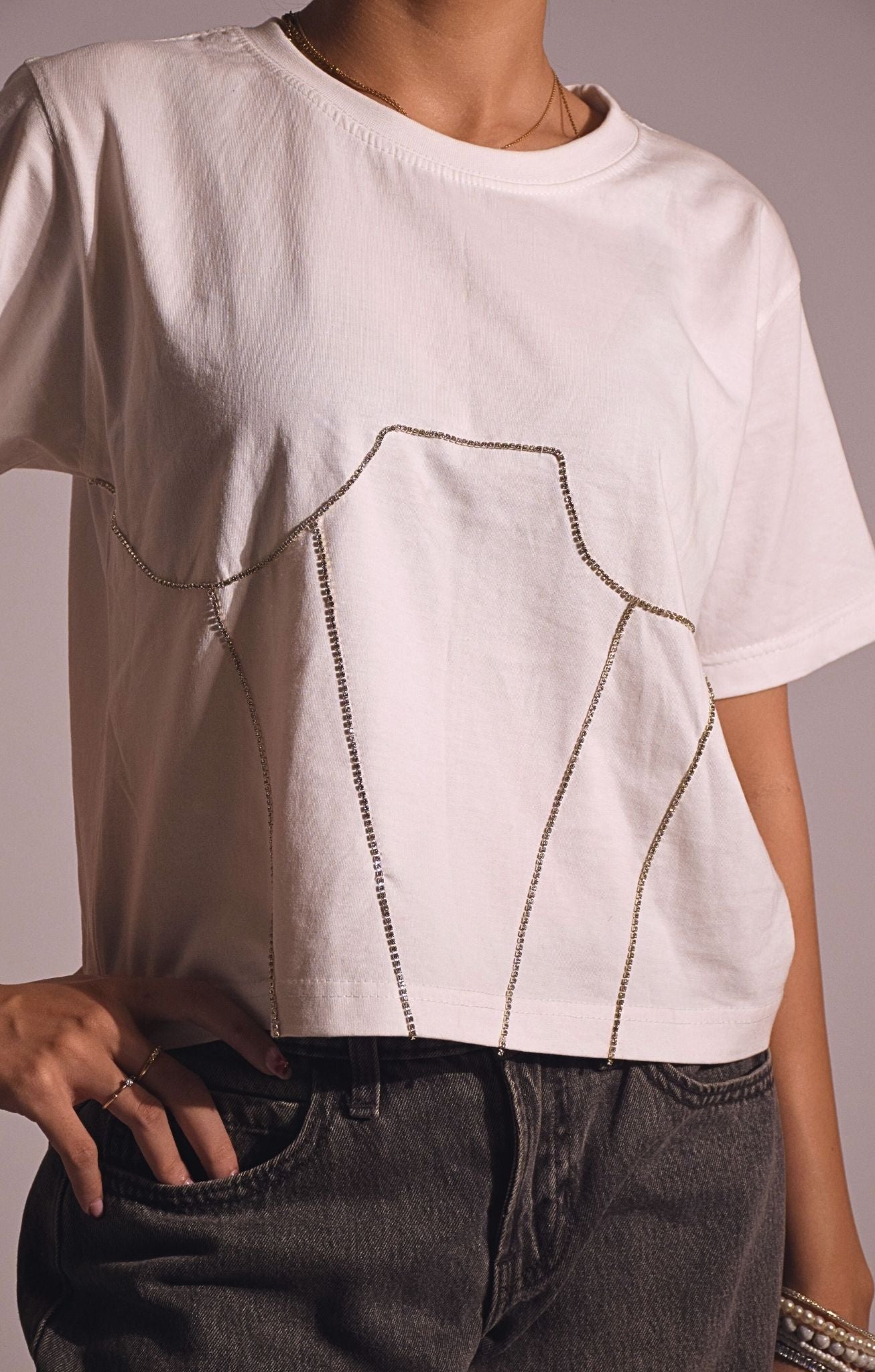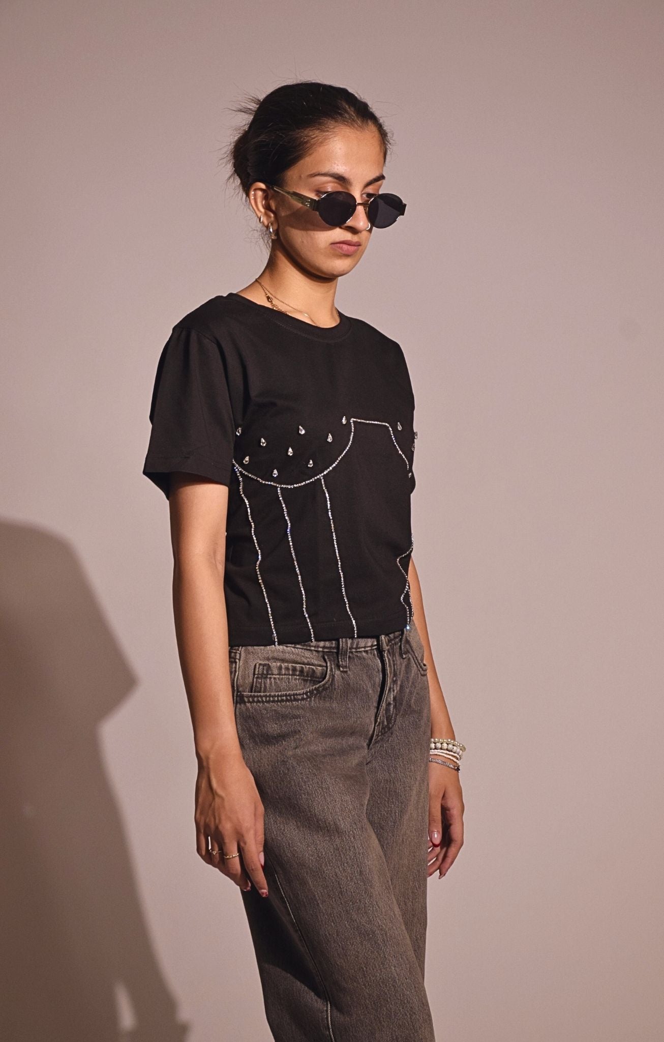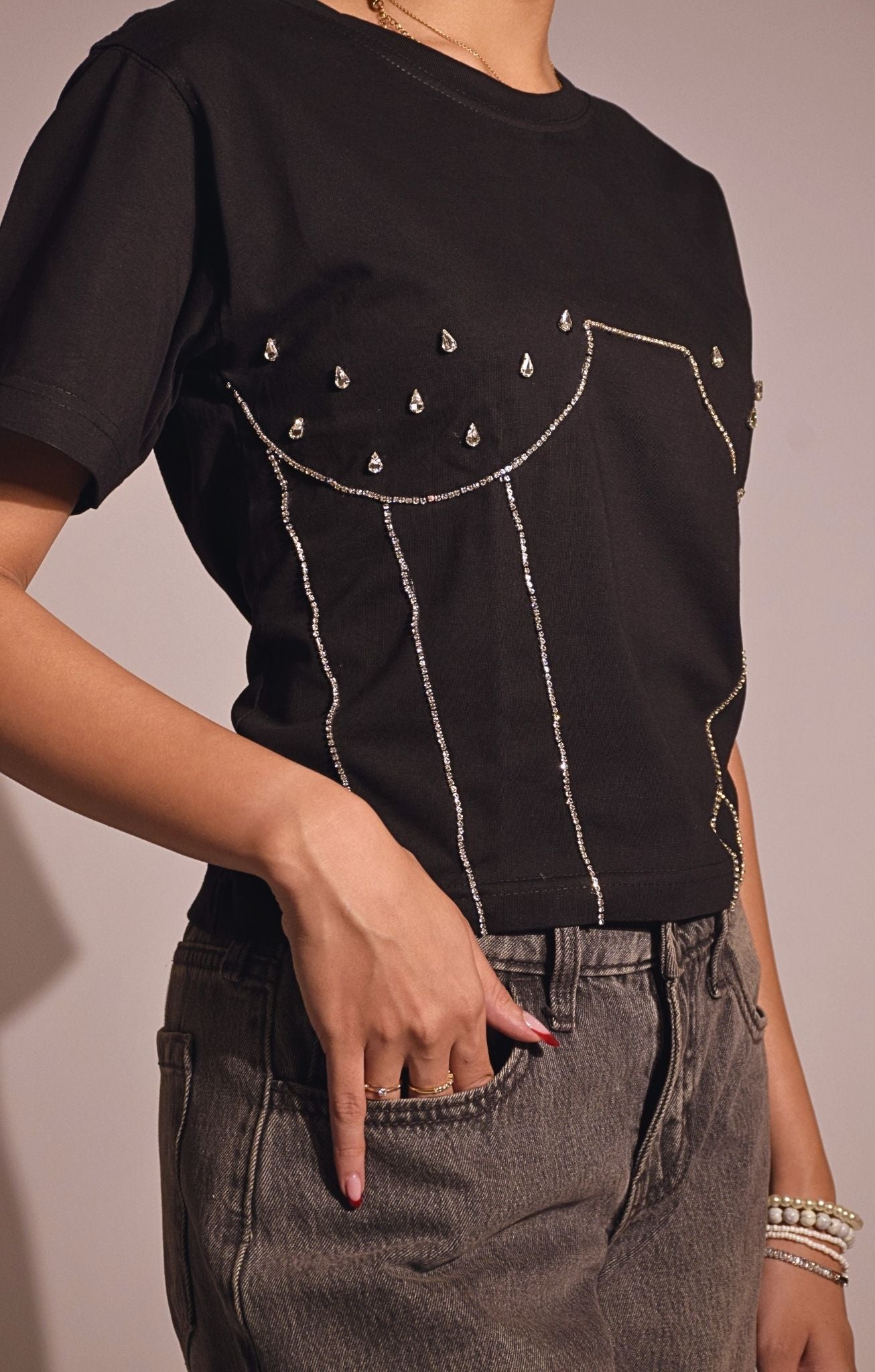 Turn heads with this bold black embellished t-shirt that merges streetwear edge with glam sophistication. Made from soft, breathable cotton, the tee features crystal-studded teardrop accents and shimmering rhinestone outlines that mimic a corset silhouette, offering a structured yet relaxed vibe. The intricate embellishments elevate this everyday staple into a true statement piece.