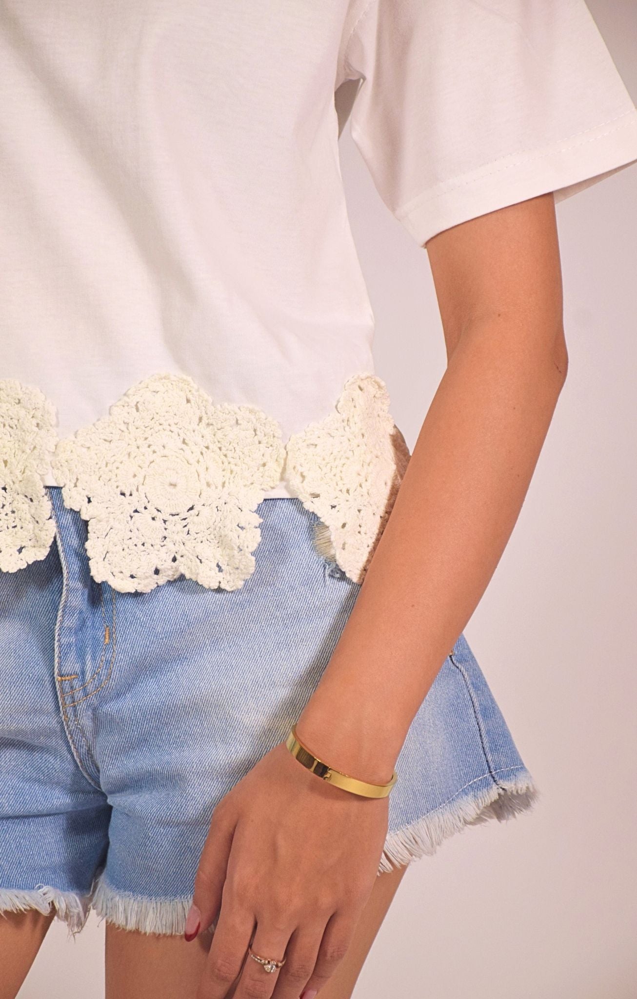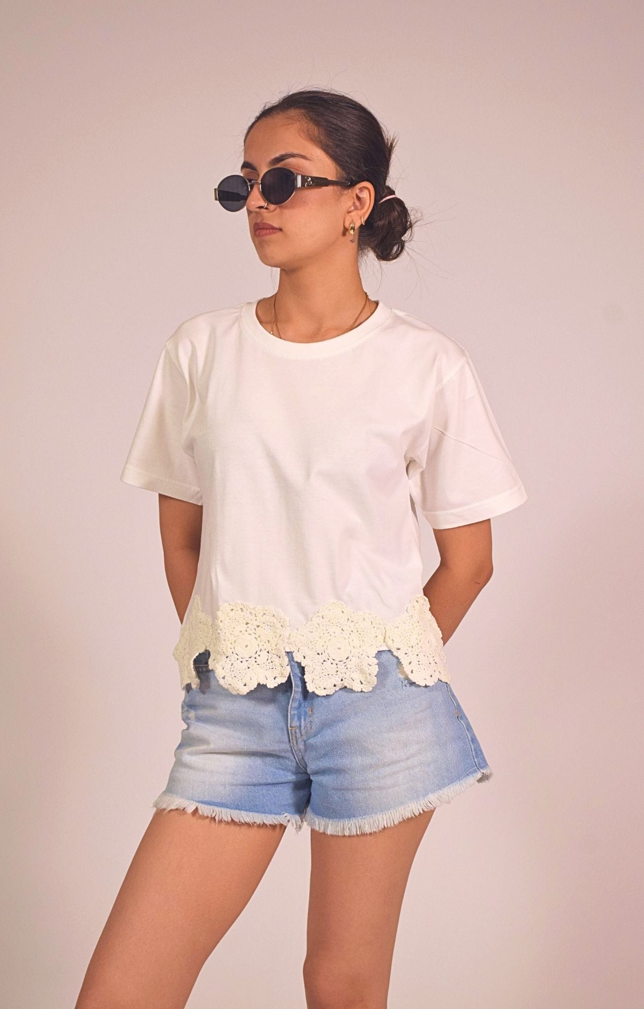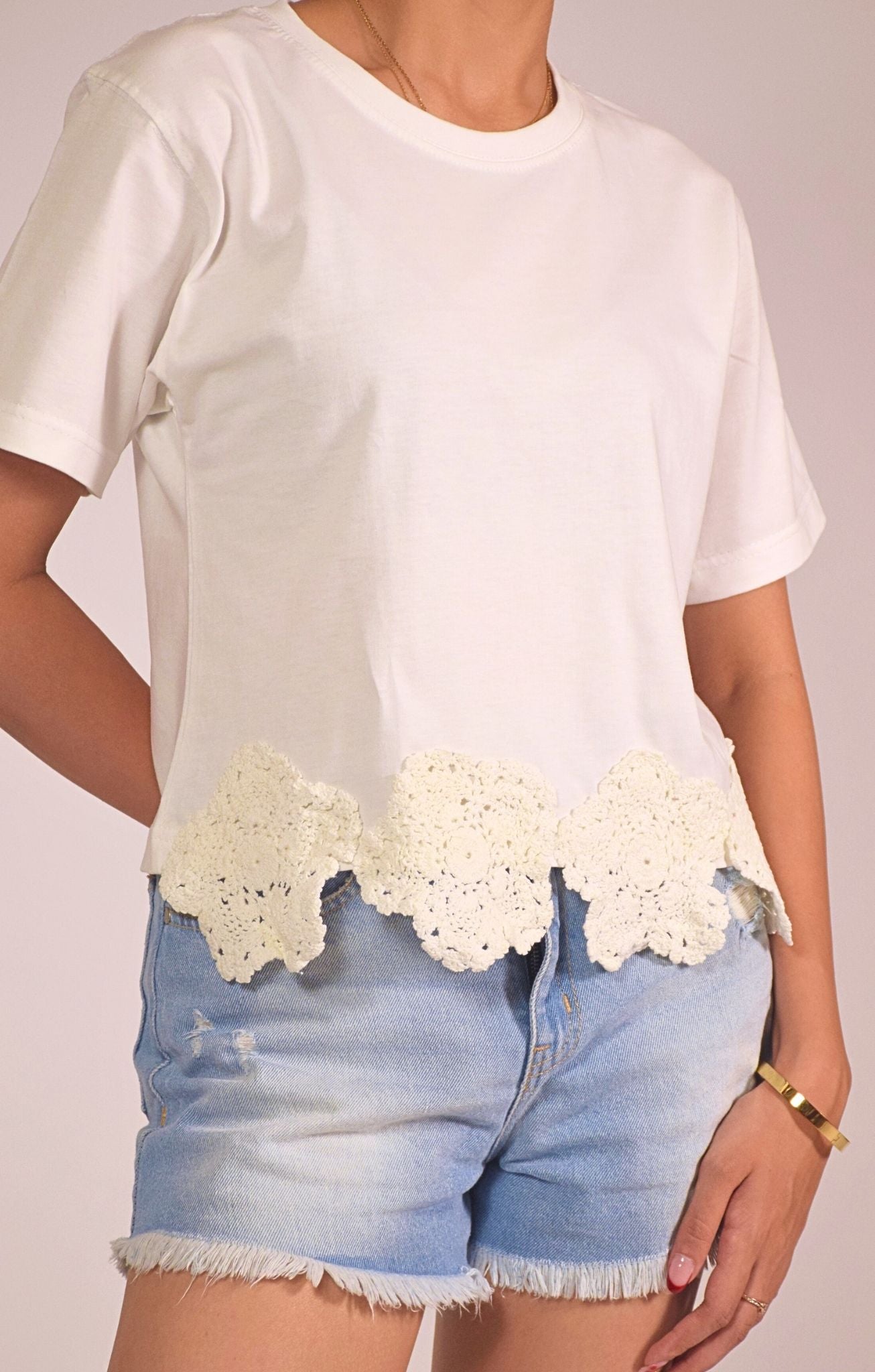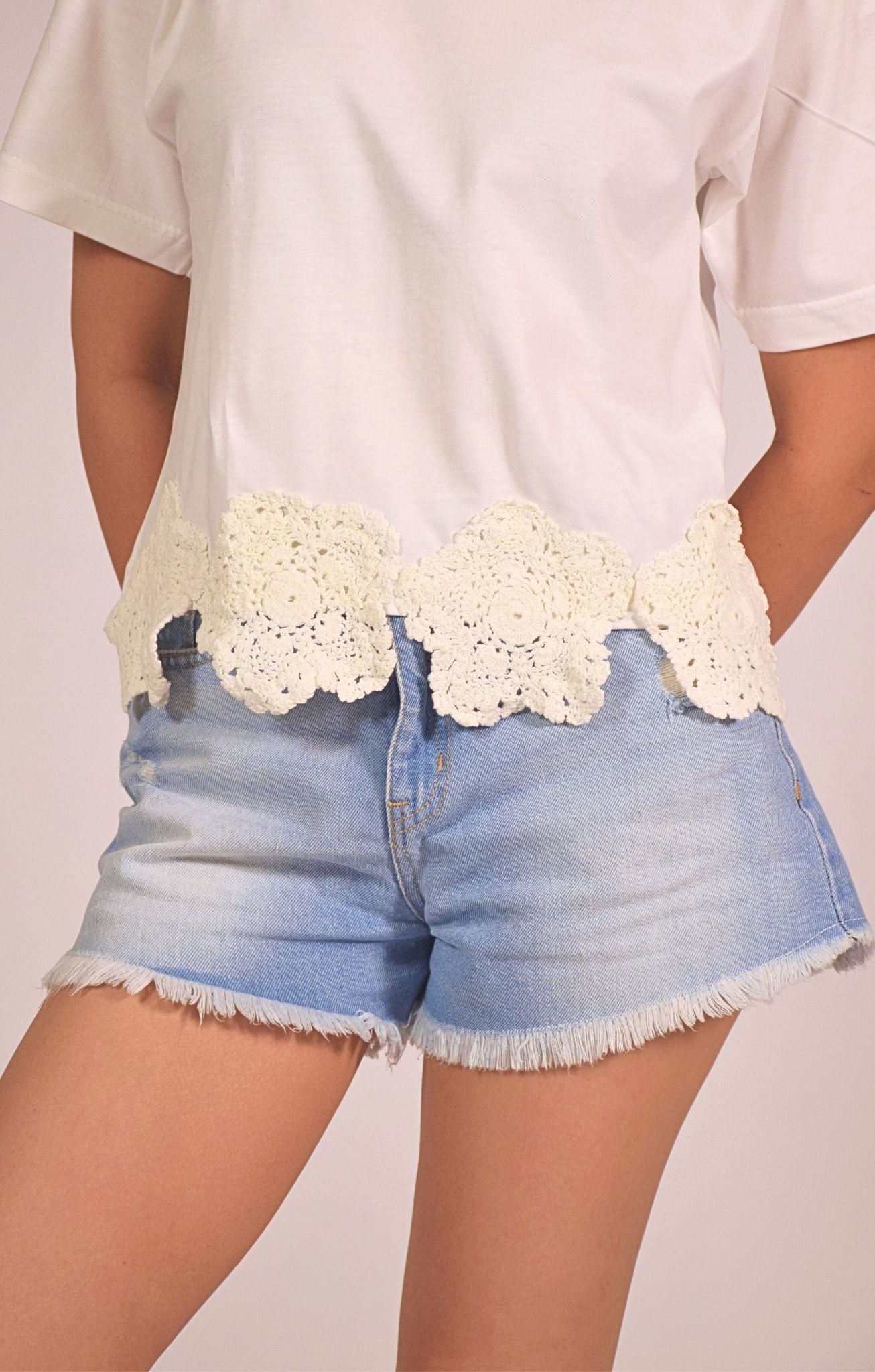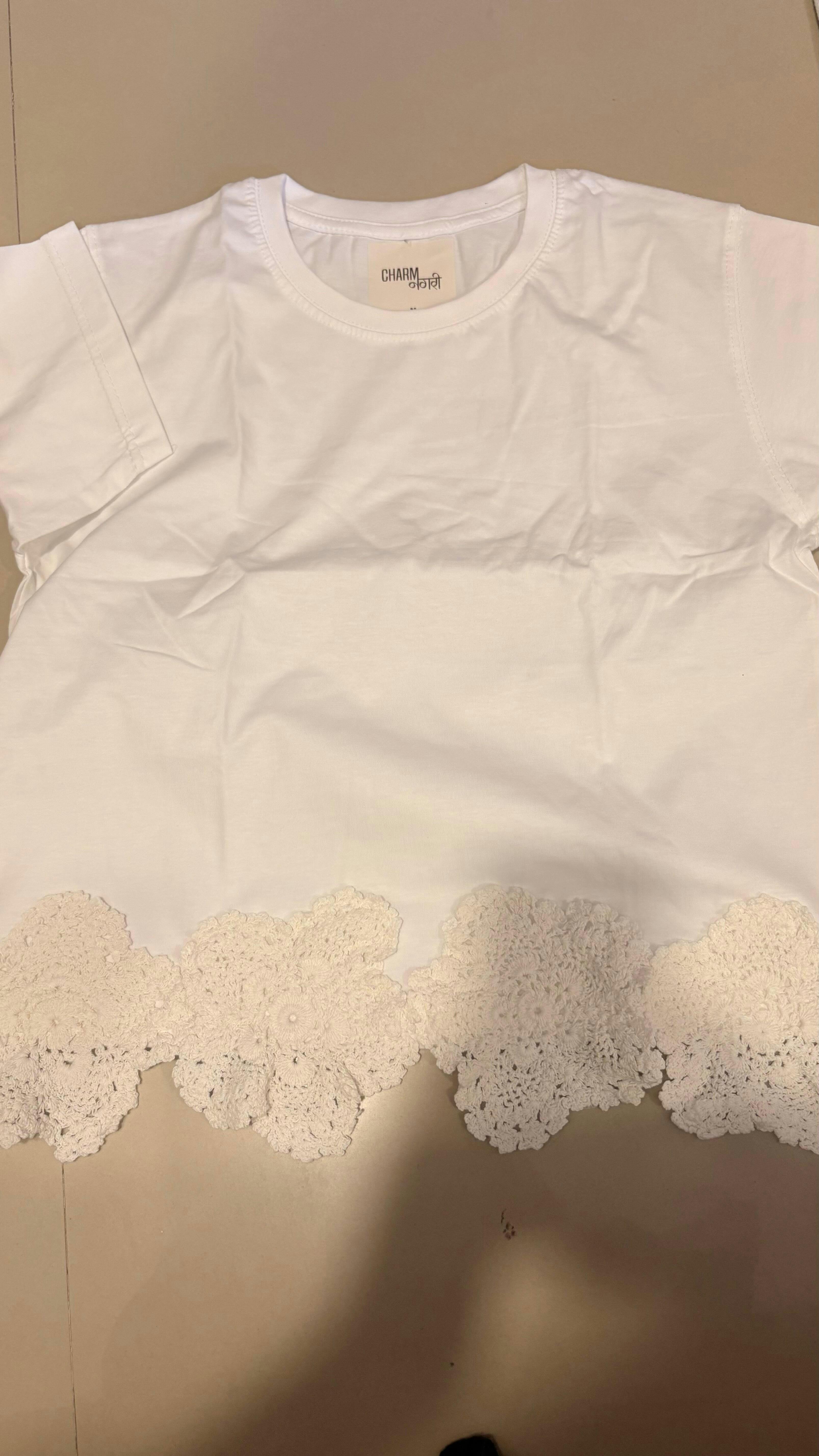Effortlessly chic and playfully feminine, this white t-shirt features a standout crochet lace trim in a floral motif along the hemline. The soft cotton base and relaxed silhouette make it a breathable and flattering everyday choice, while the scalloped lace adds a charming, handcrafted touch. A perfect balance of casual and crafted detail, it brings an elevated twist to your staple tee collection.