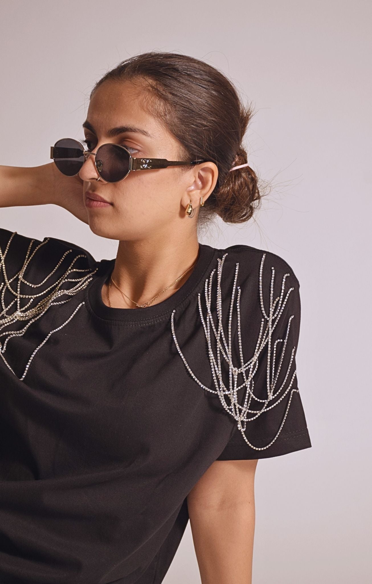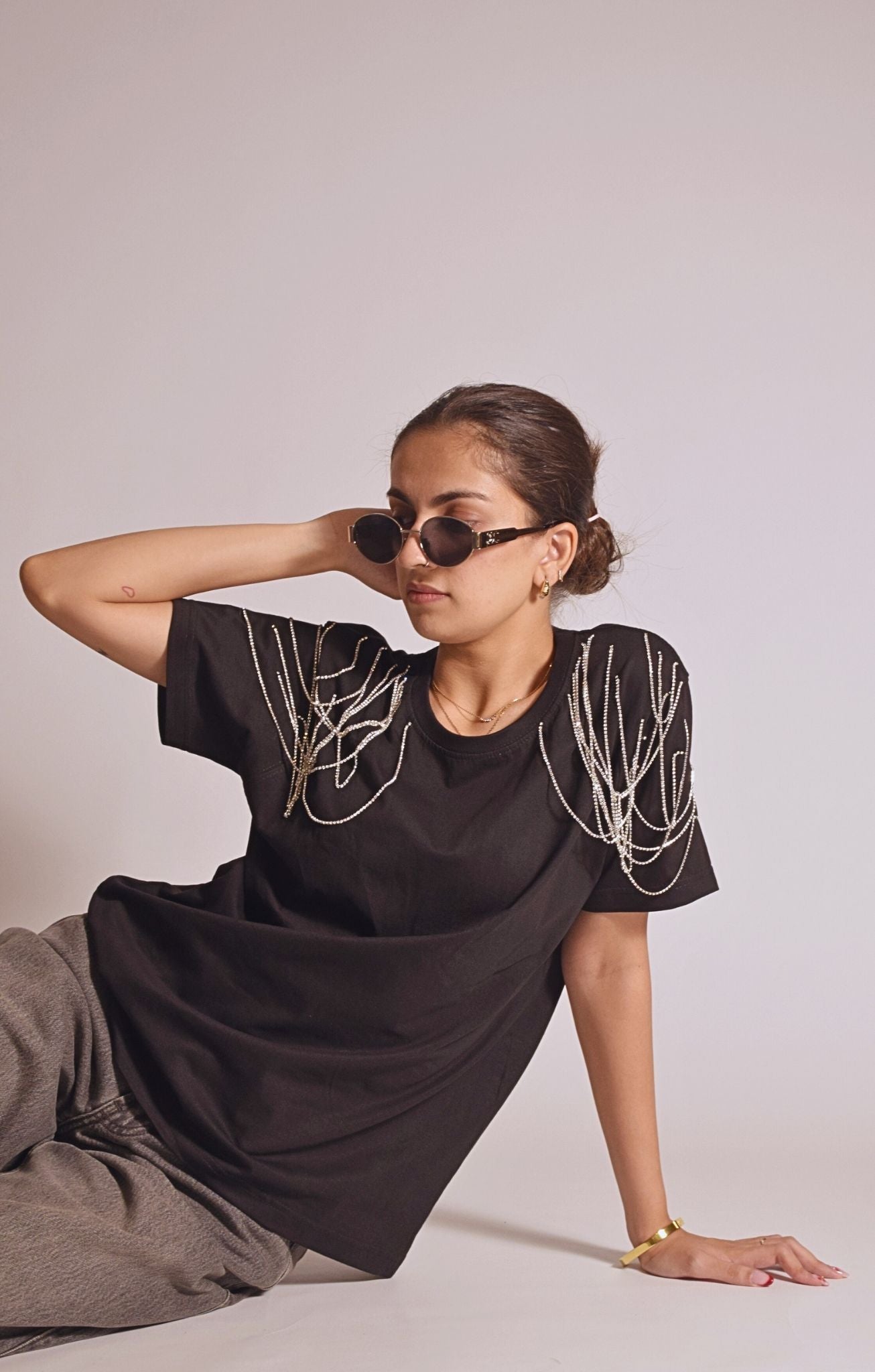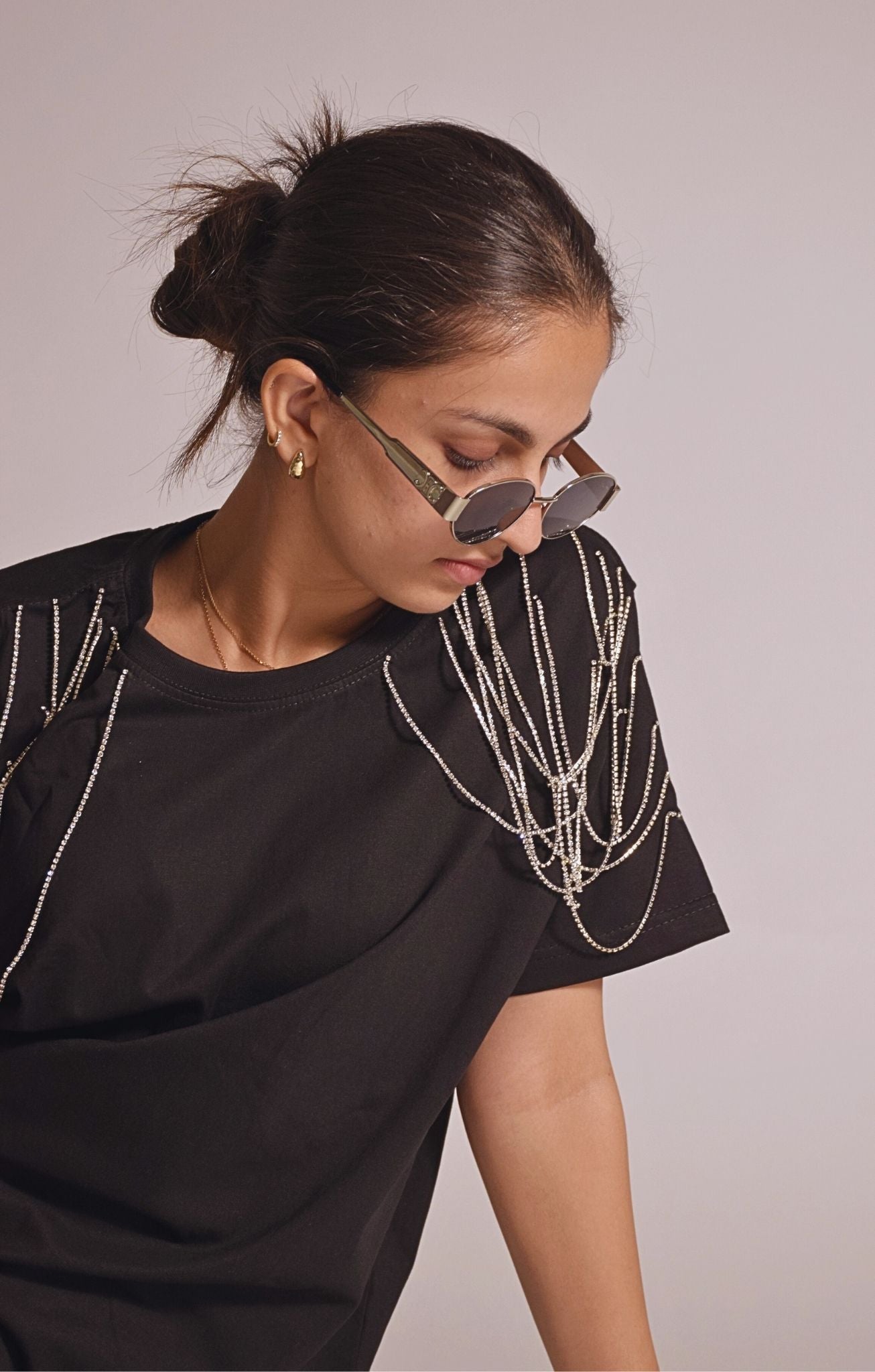 Make an effortless style statement with this bold and edgy Black Statement Shoulder Chain T-Shirt. Crafted from soft, breathable cotton fabric, this relaxed-fit tee is elevated with cascading metallic chain embellishments draped over each shoulder, adding a glamorous, high-fashion twist to a casual essential. The minimal round neckline and classic short sleeves keep it versatile, while the dramatic detailing gives it standout appeal—perfect for dressing up or down.