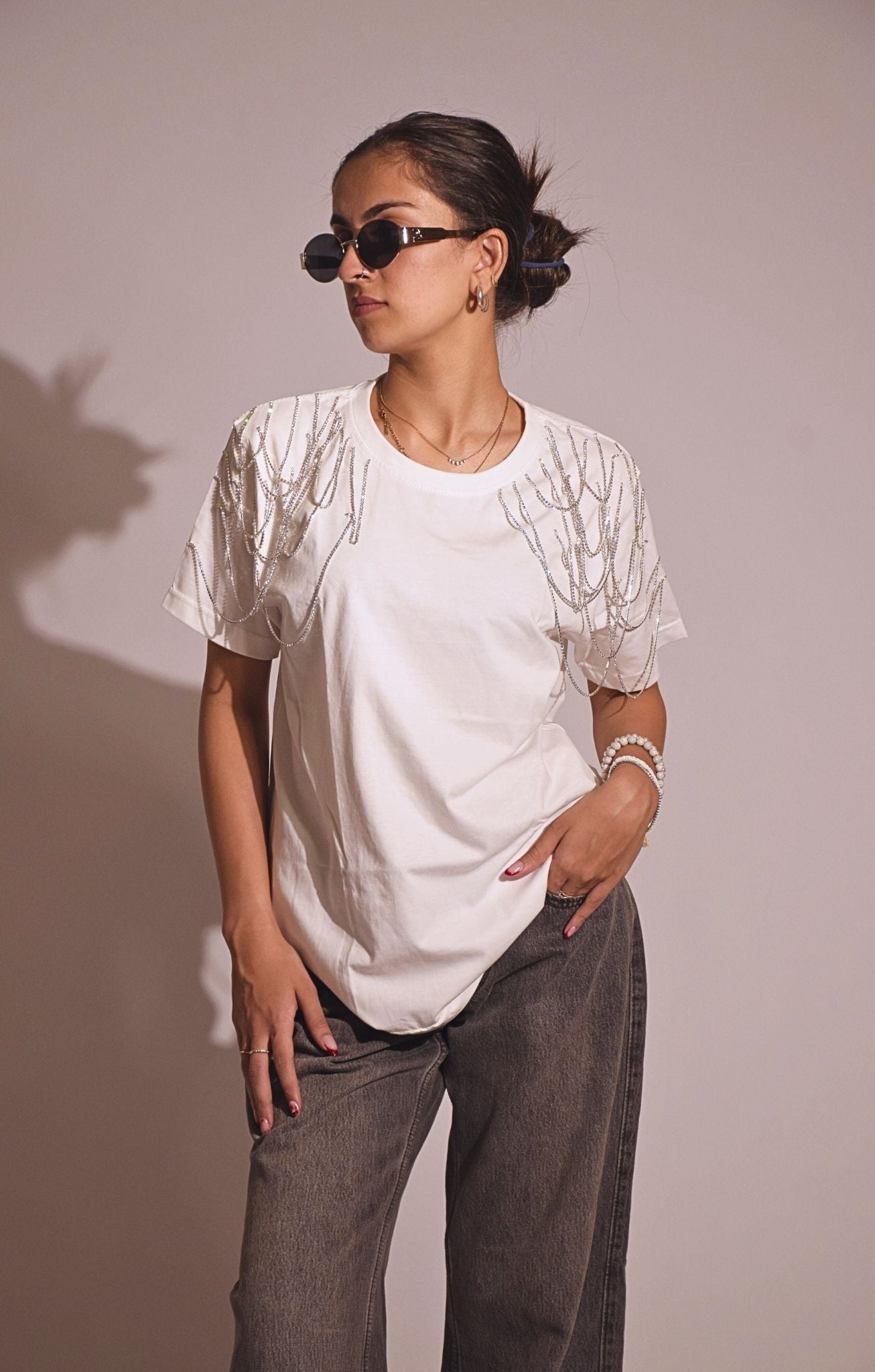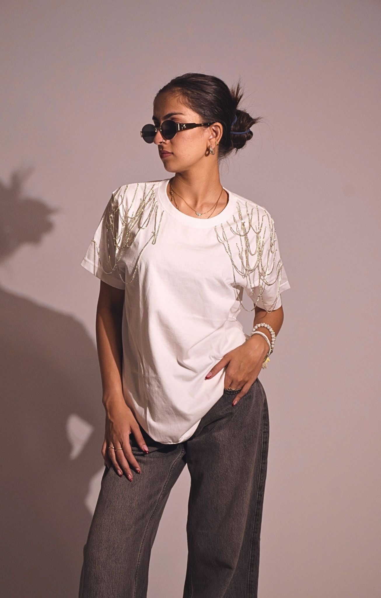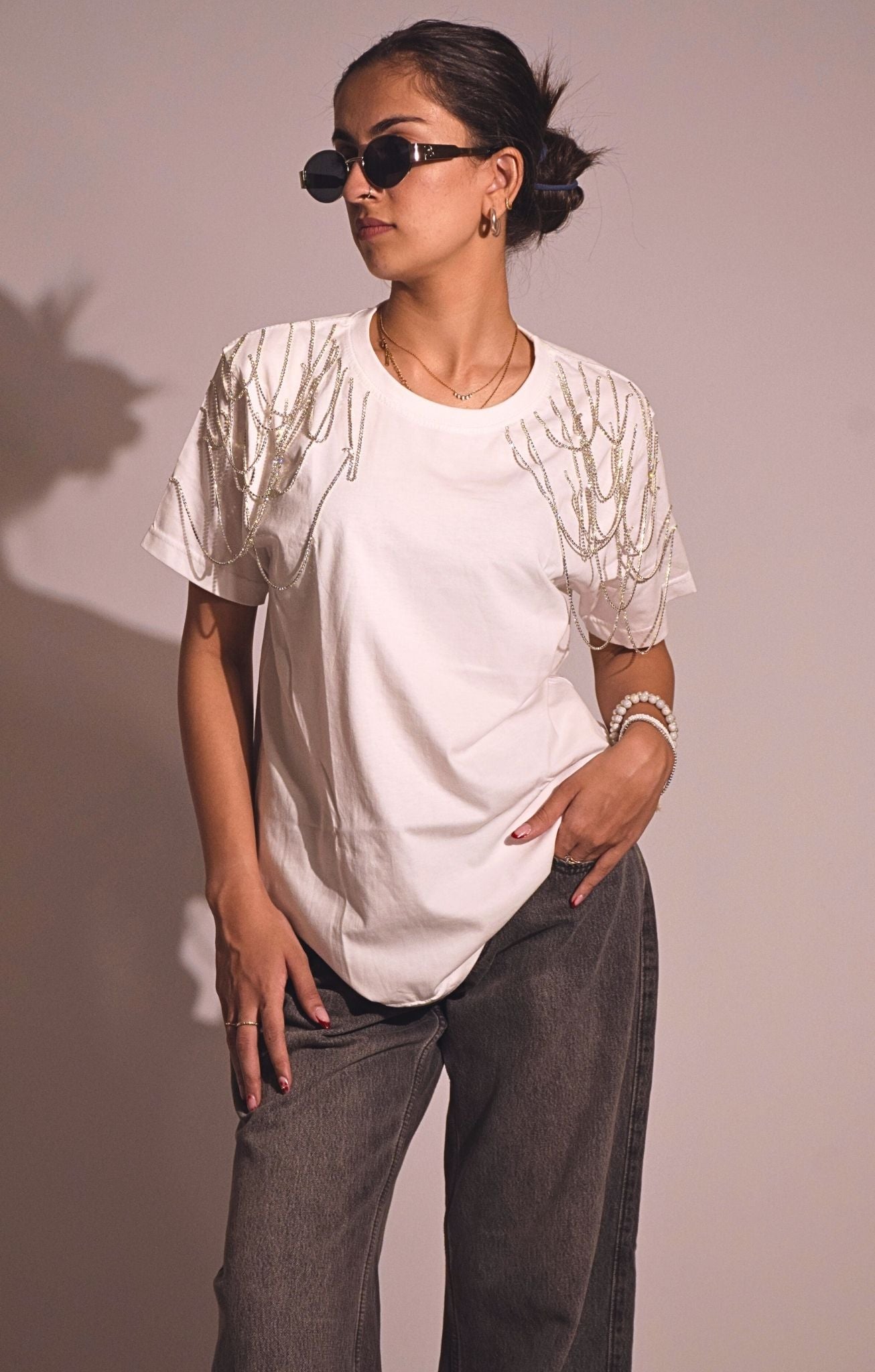 Make an effortless style statement with this bold and edgy Black Statement Shoulder Chain T-Shirt. Crafted from soft, breathable cotton fabric, this relaxed-fit tee is elevated with cascading metallic chain embellishments draped over each shoulder, adding a glamorous, high-fashion twist to a casual essential. The minimal round neckline and classic short sleeves keep it versatile, while the dramatic detailing gives it standout appeal—perfect for dressing up or down.