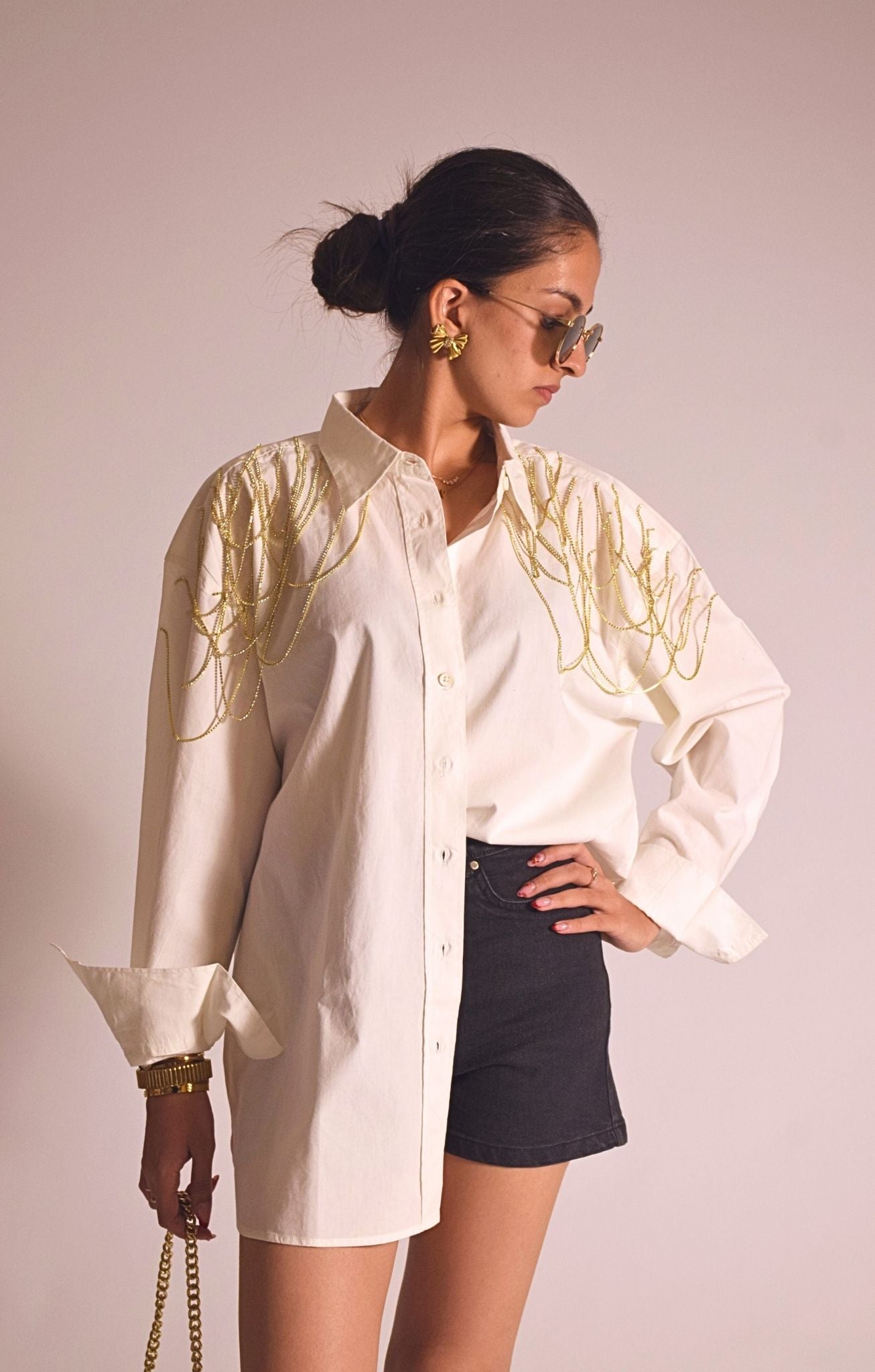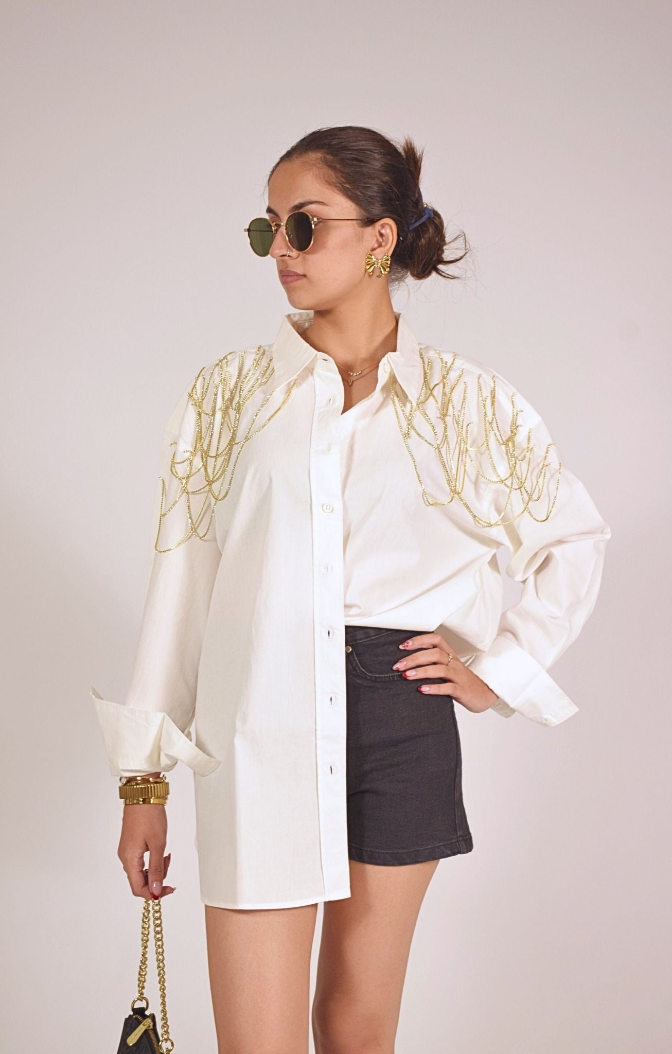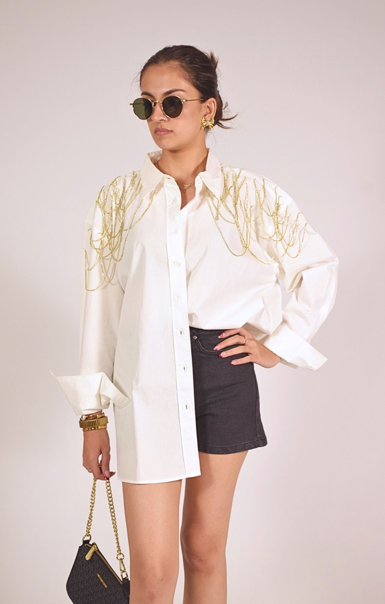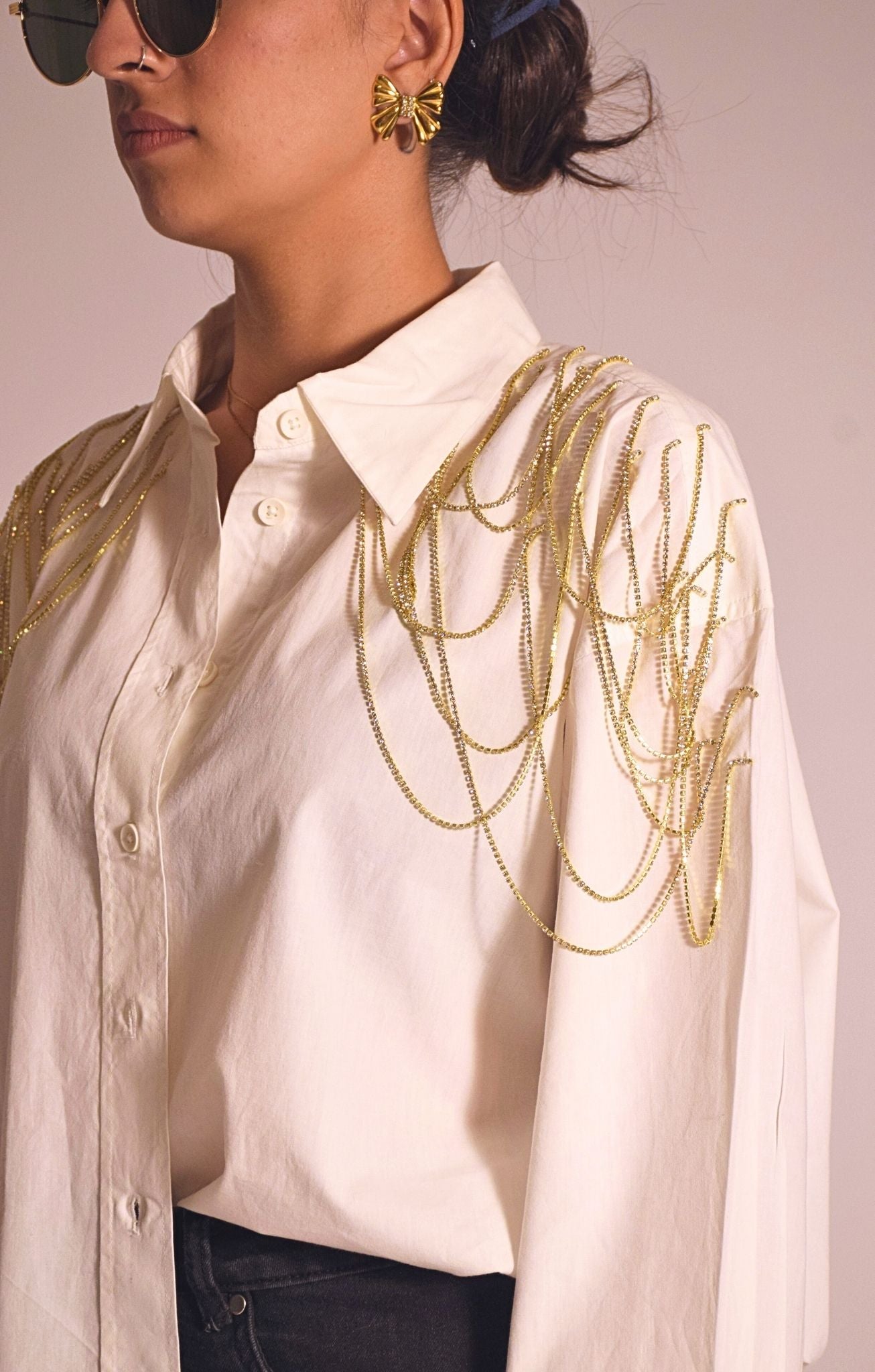 What sets this shirt apart is its Golden chain detailing gracefully cascading across the shoulders and upper chest, adding a bold, fashion-forward twist. Whether you're styling it with tailored trousers for a power look or denim for casual glam, this shirt delivers instant sophistication and standout style.