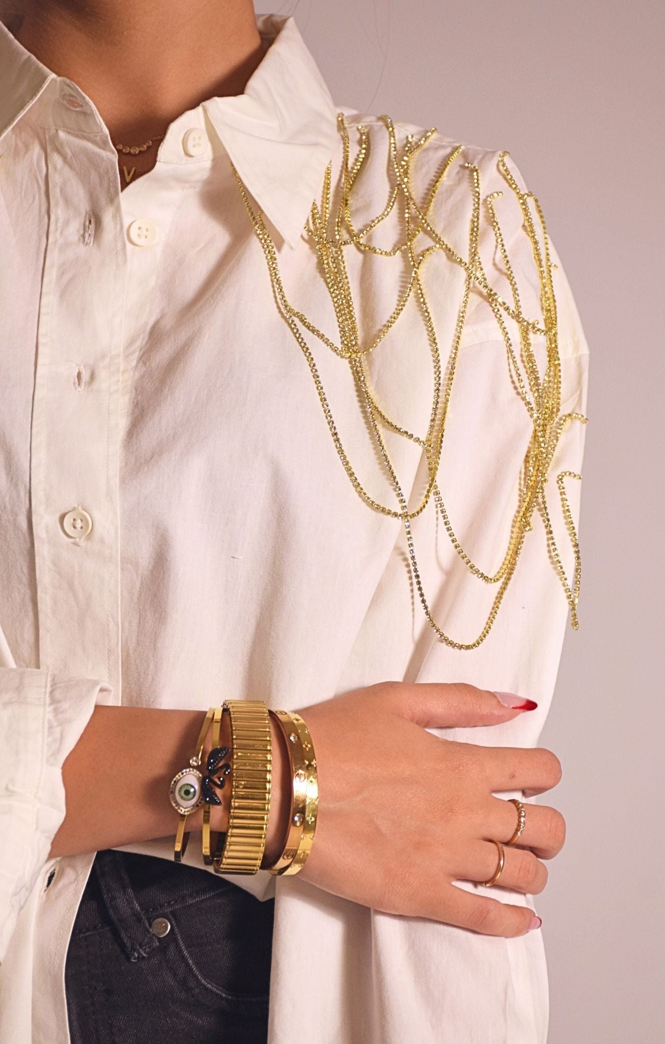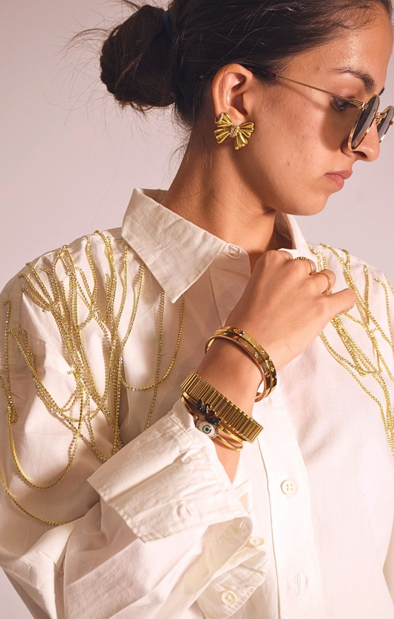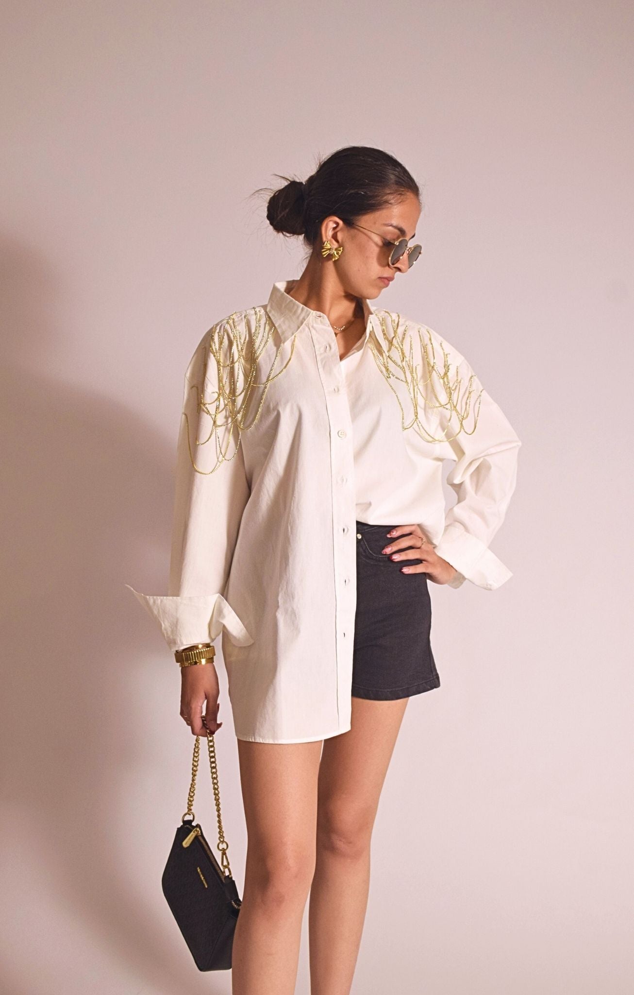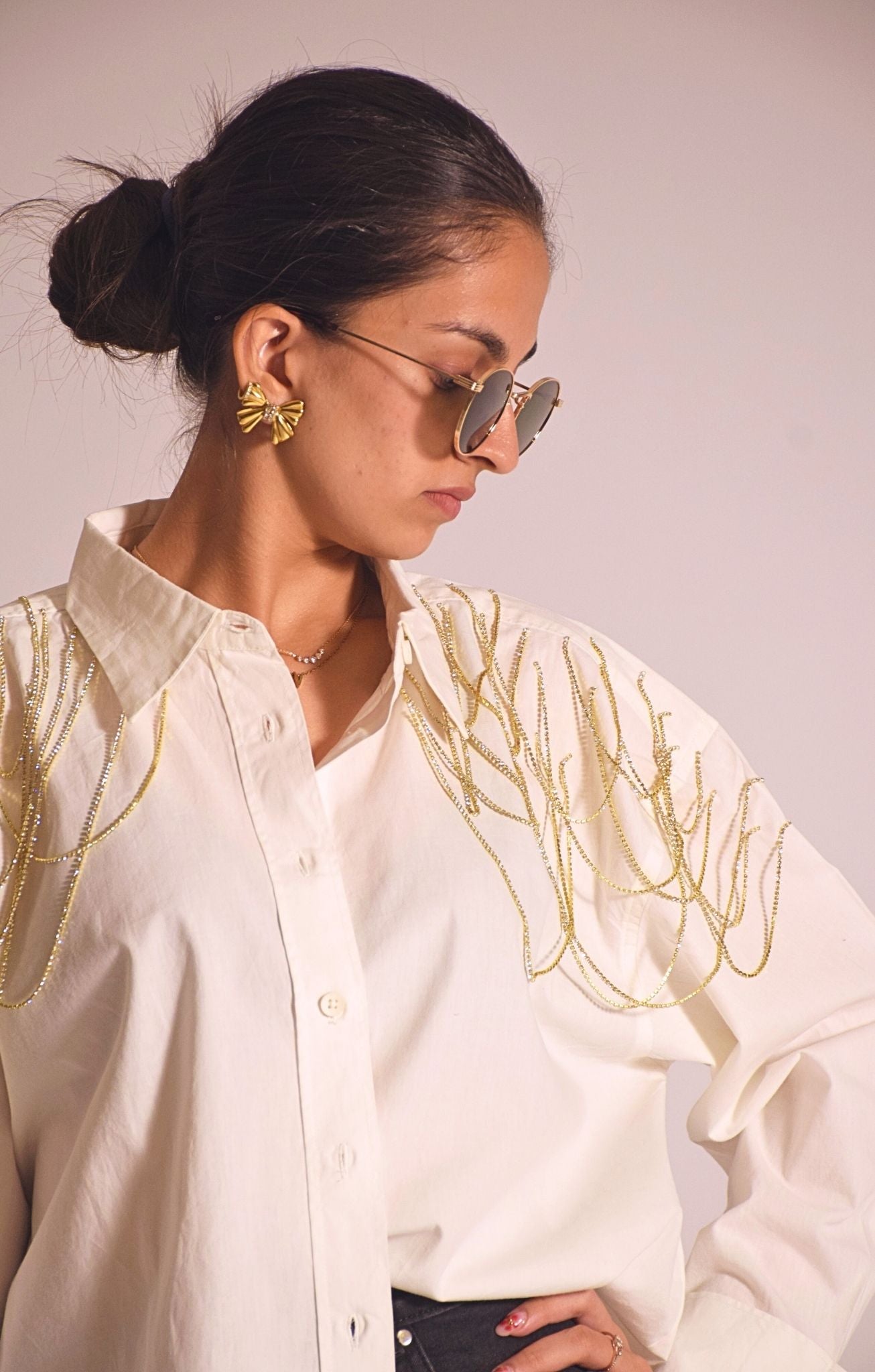 What sets this shirt apart is its Golden chain detailing gracefully cascading across the shoulders and upper chest, adding a bold, fashion-forward twist. Whether you're styling it with tailored trousers for a power look or denim for casual glam, this shirt delivers instant sophistication and standout style.