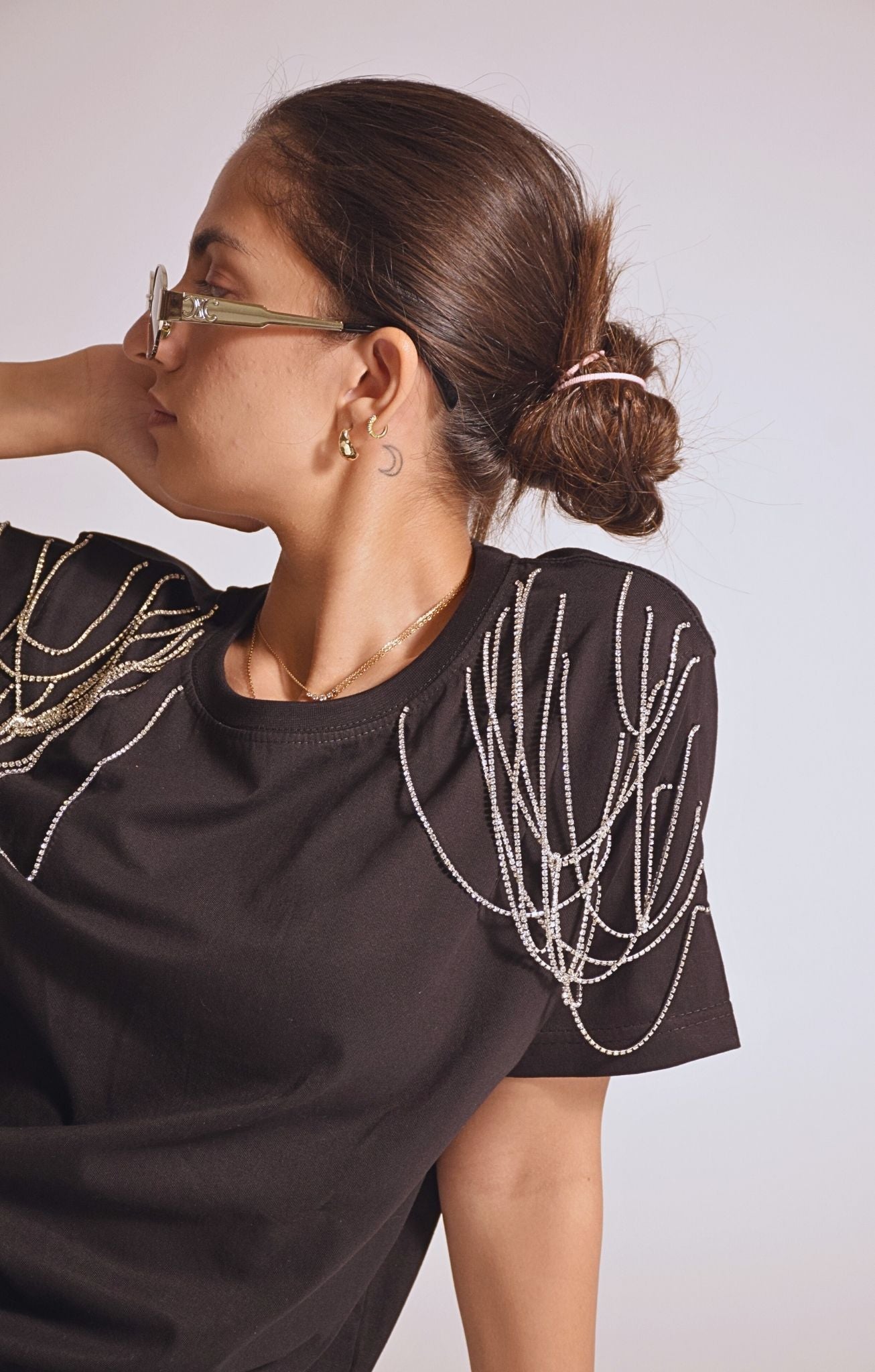 Make an effortless style statement with this bold and edgy Black Statement Shoulder Chain T-Shirt. Crafted from soft, breathable cotton fabric, this relaxed-fit tee is elevated with cascading metallic chain embellishments draped over each shoulder, adding a glamorous, high-fashion twist to a casual essential. The minimal round neckline and classic short sleeves keep it versatile, while the dramatic detailing gives it standout appeal—perfect for dressing up or down.