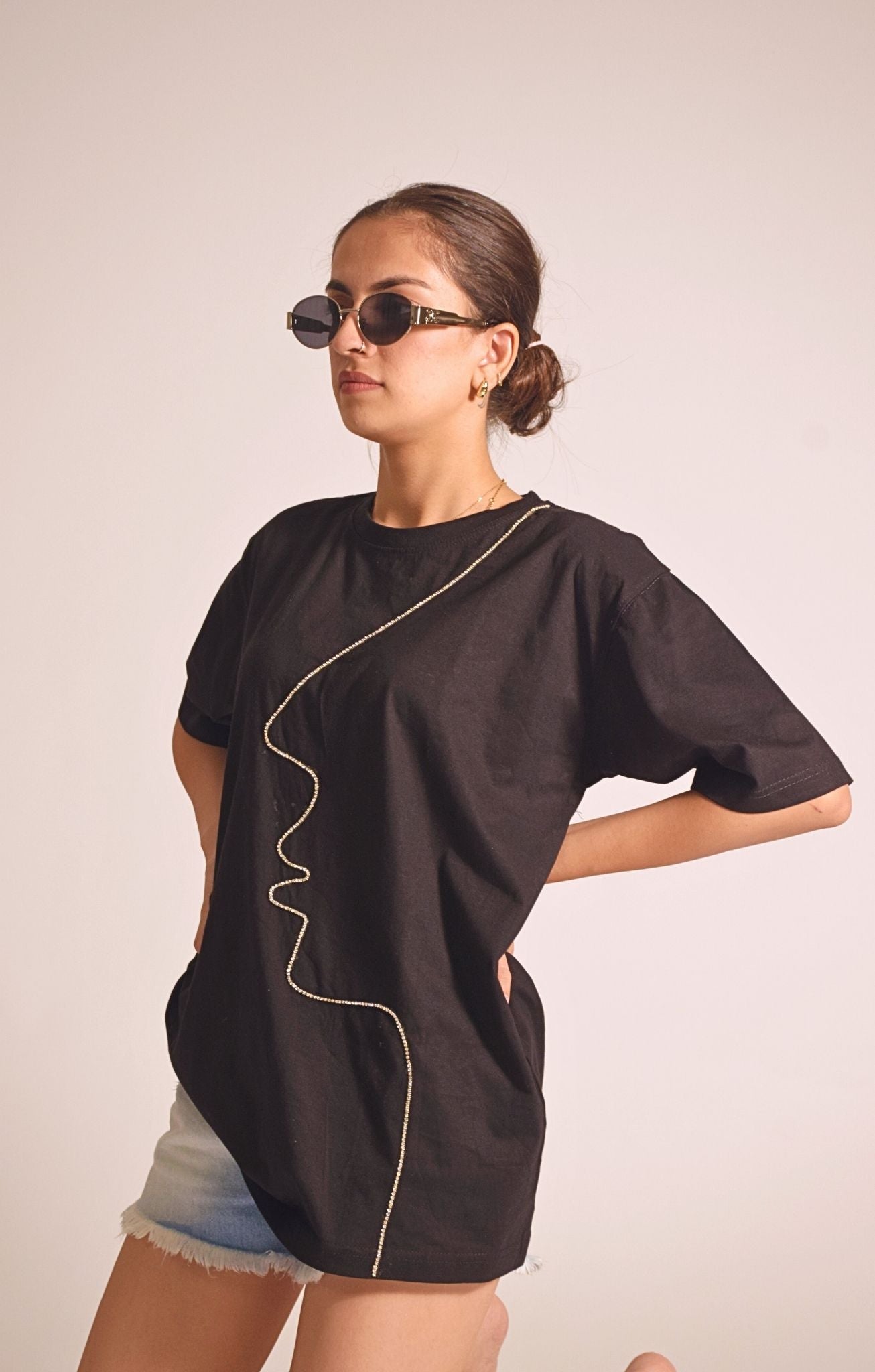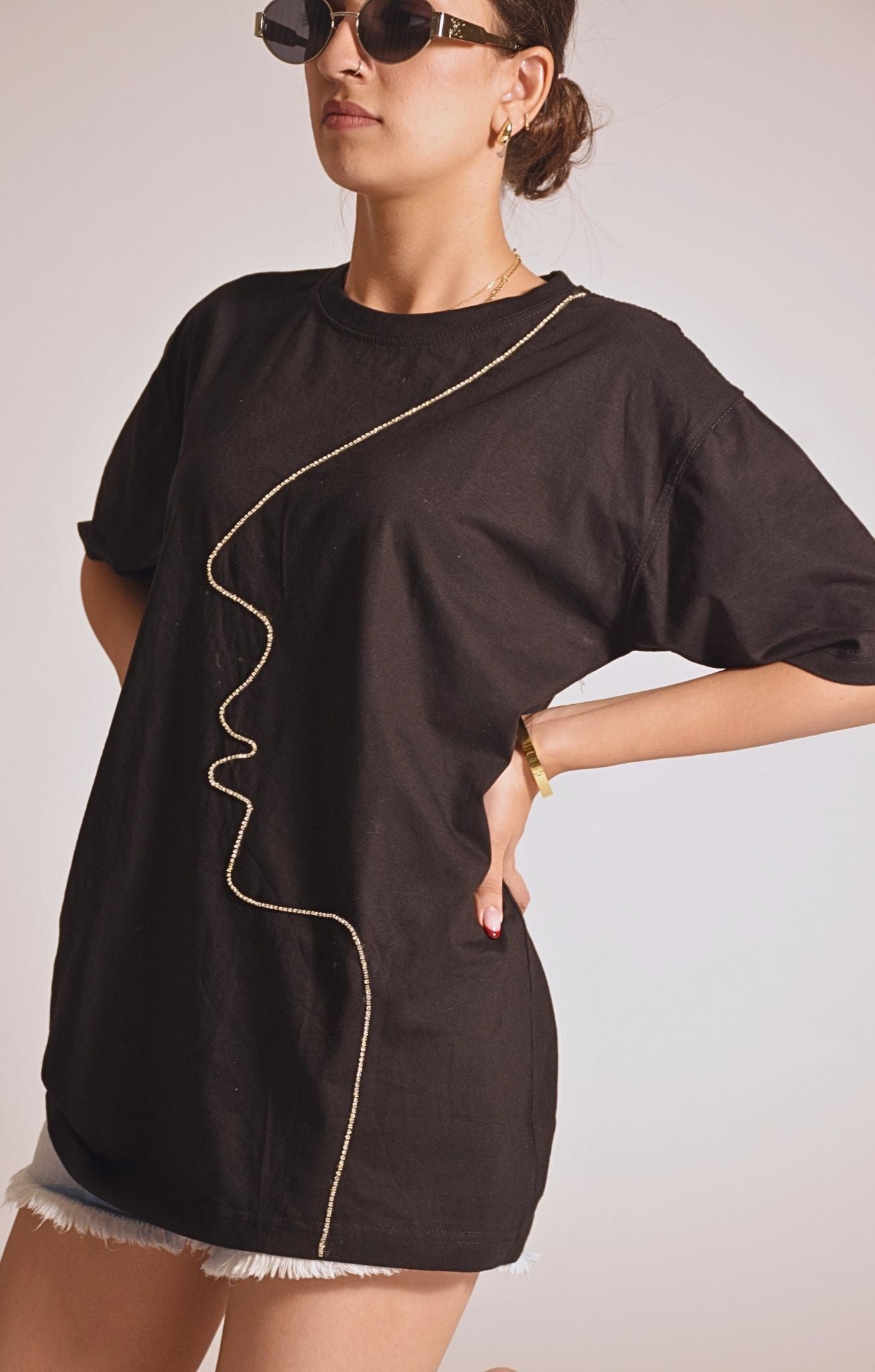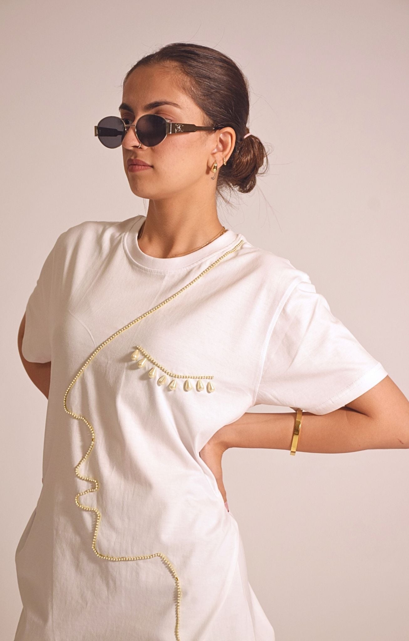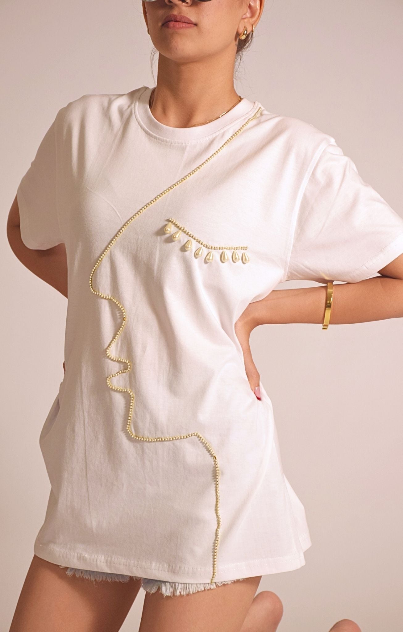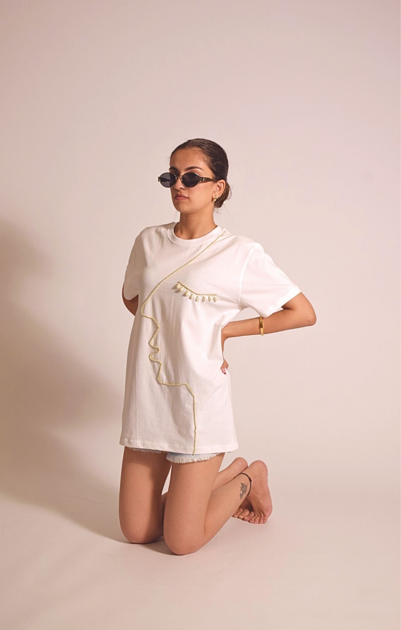 Make a bold statement with this artistic face-outline t-shirt, featuring minimalist embroidery and pearl accents. The clean silhouette of the face, traced with beadwork, is elevated by 3D pearl “lashes,” giving it an avant-garde and fashion-forward vibe. Crafted from soft, breathable cotton, this tee combines comfort with creative expression—perfect for those who love wearable art.
