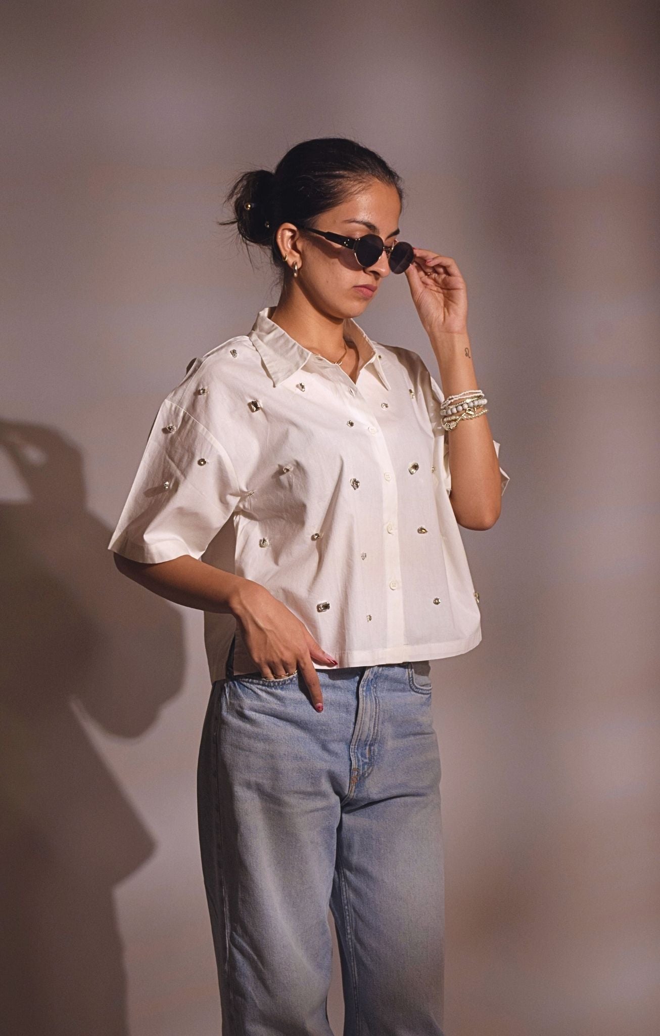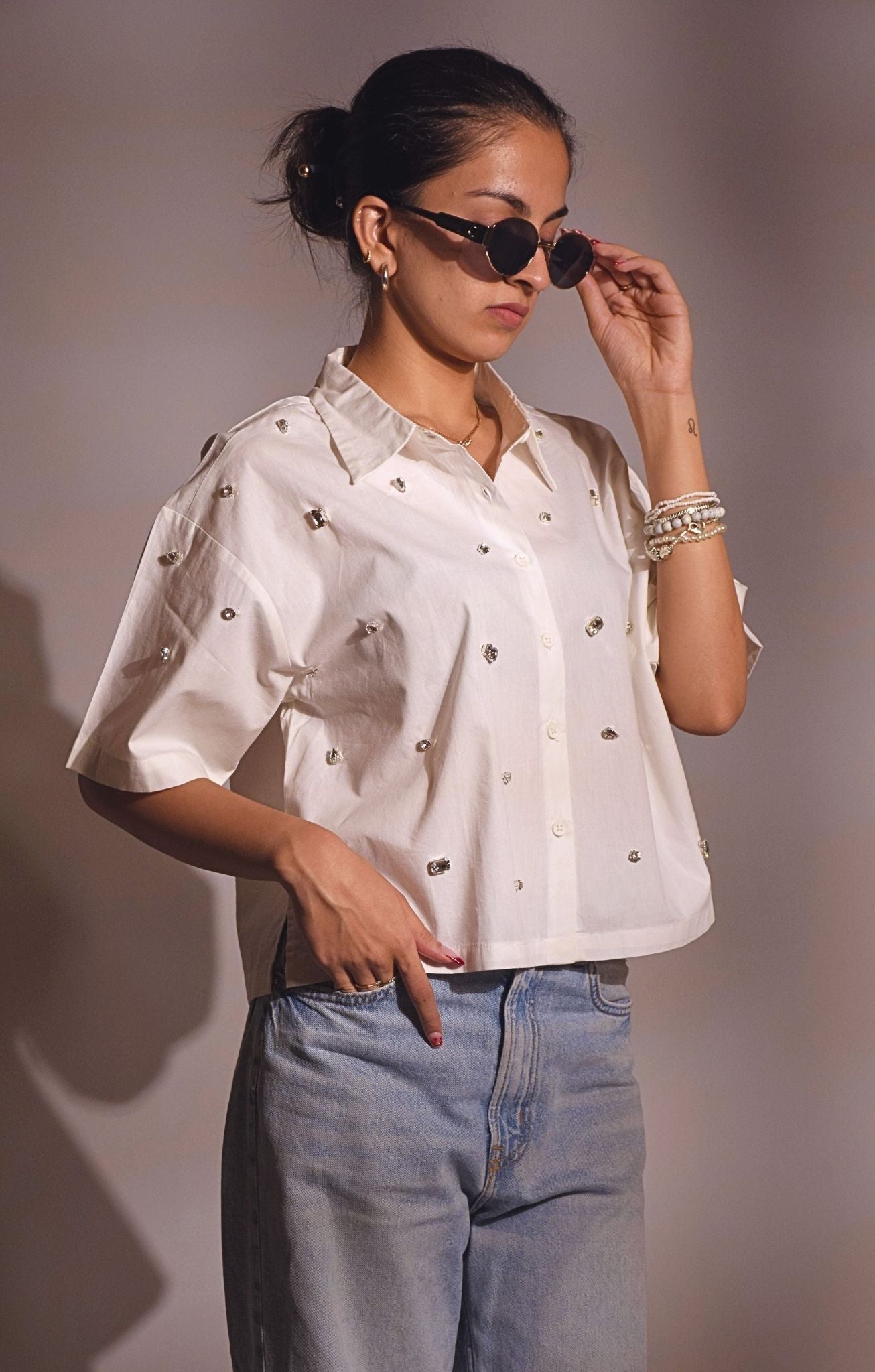 Elevate your basics with this short-sleeved white shirt adorned with scattered crystal embellishments for that perfect pop of sparkle. Featuring a relaxed, boxy silhouette and classic collar, this piece combines effortless comfort with subtle glam. The randomly placed gemstones lend a modern, artsy vibe—ideal for making a statement without going over the top.