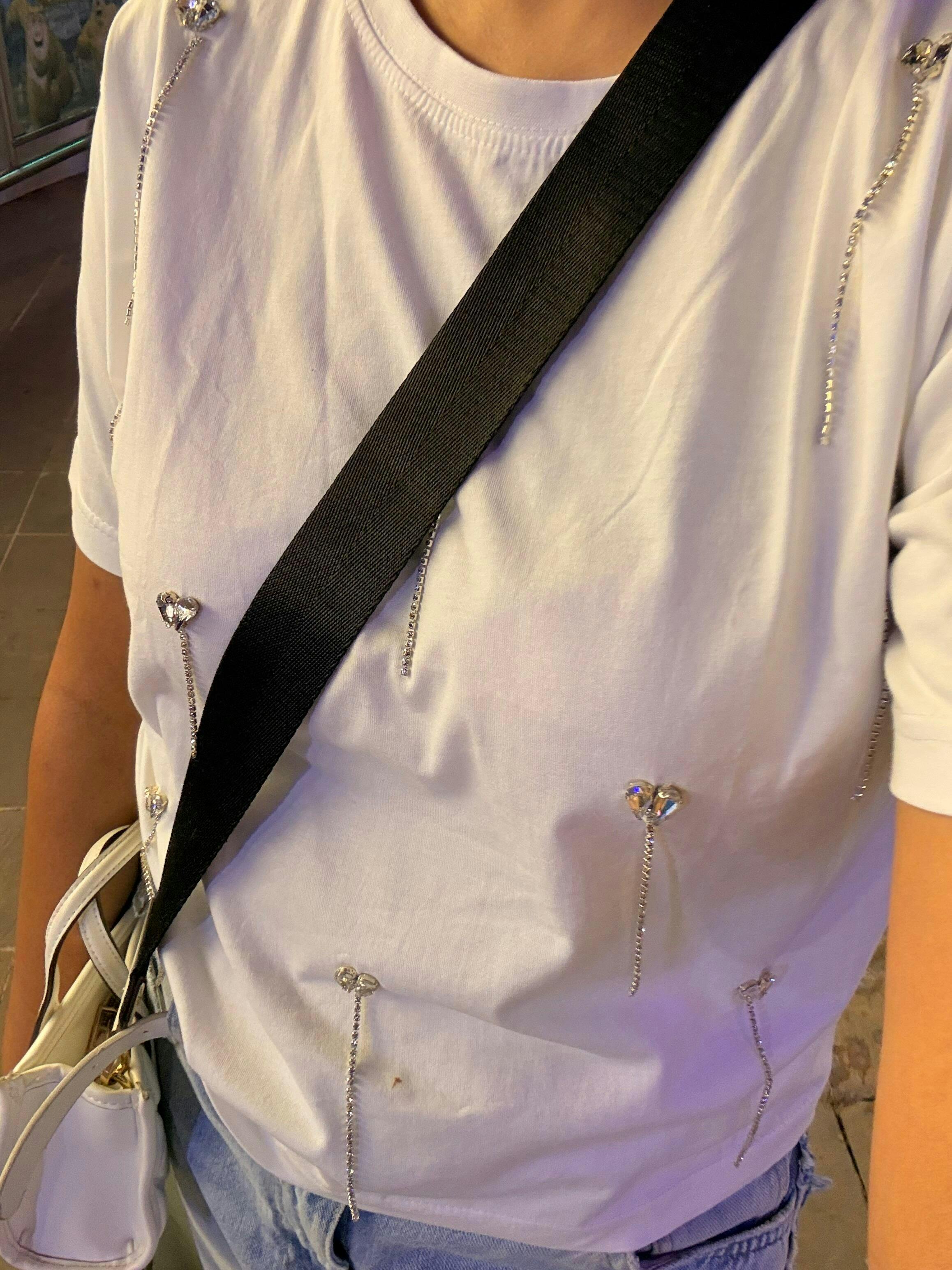 Add a touch of glam to your casual wardrobe with this dreamy white t-shirt adorned with crystal heart embellishments and delicate dangling chains. Crafted from soft, breathable cotton, this tee combines comfort with elevated detailing. The subtle shine of rhinestone hearts offers a romantic yet modern edge, making it an effortless statement piece for day or night.