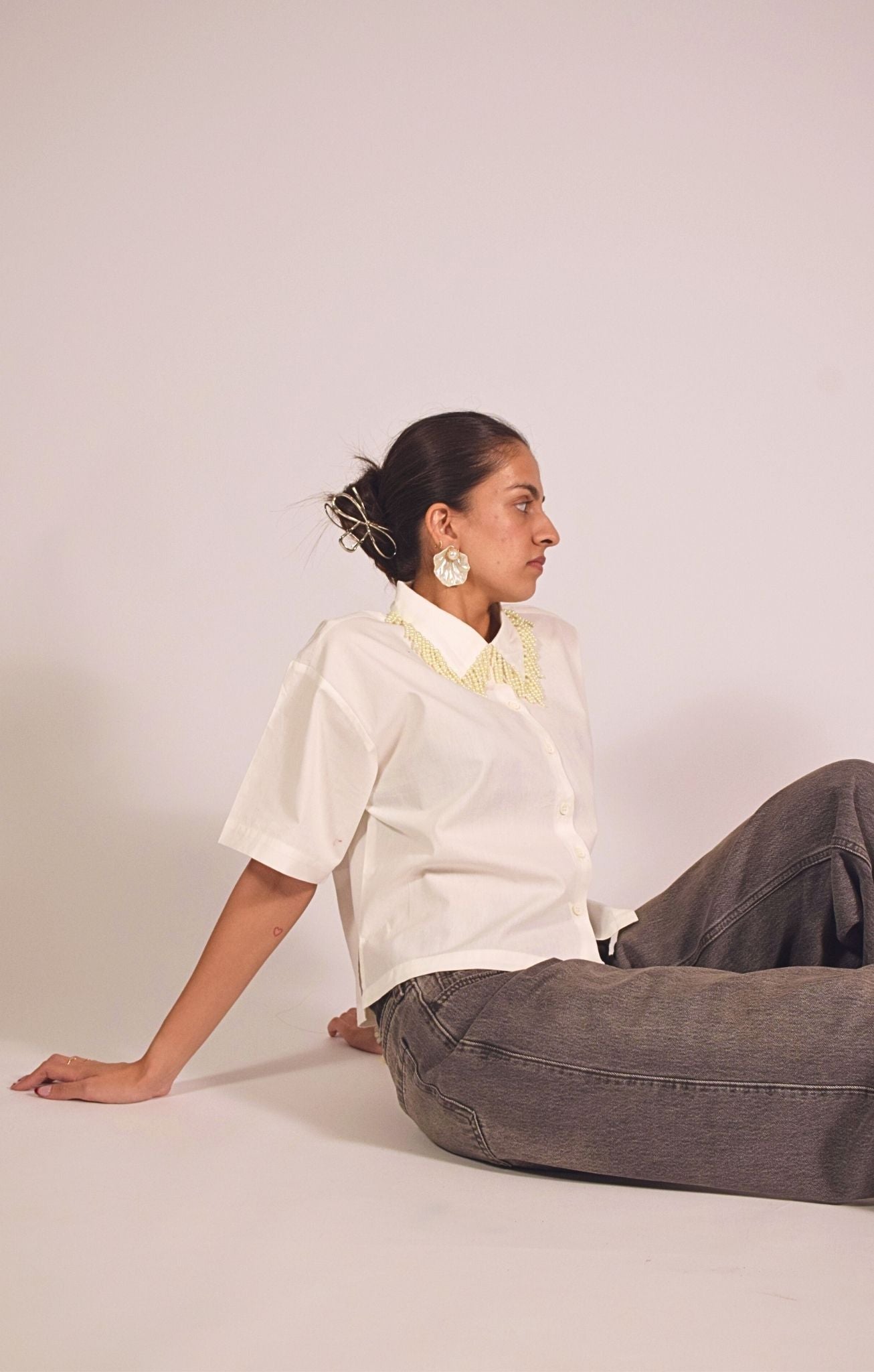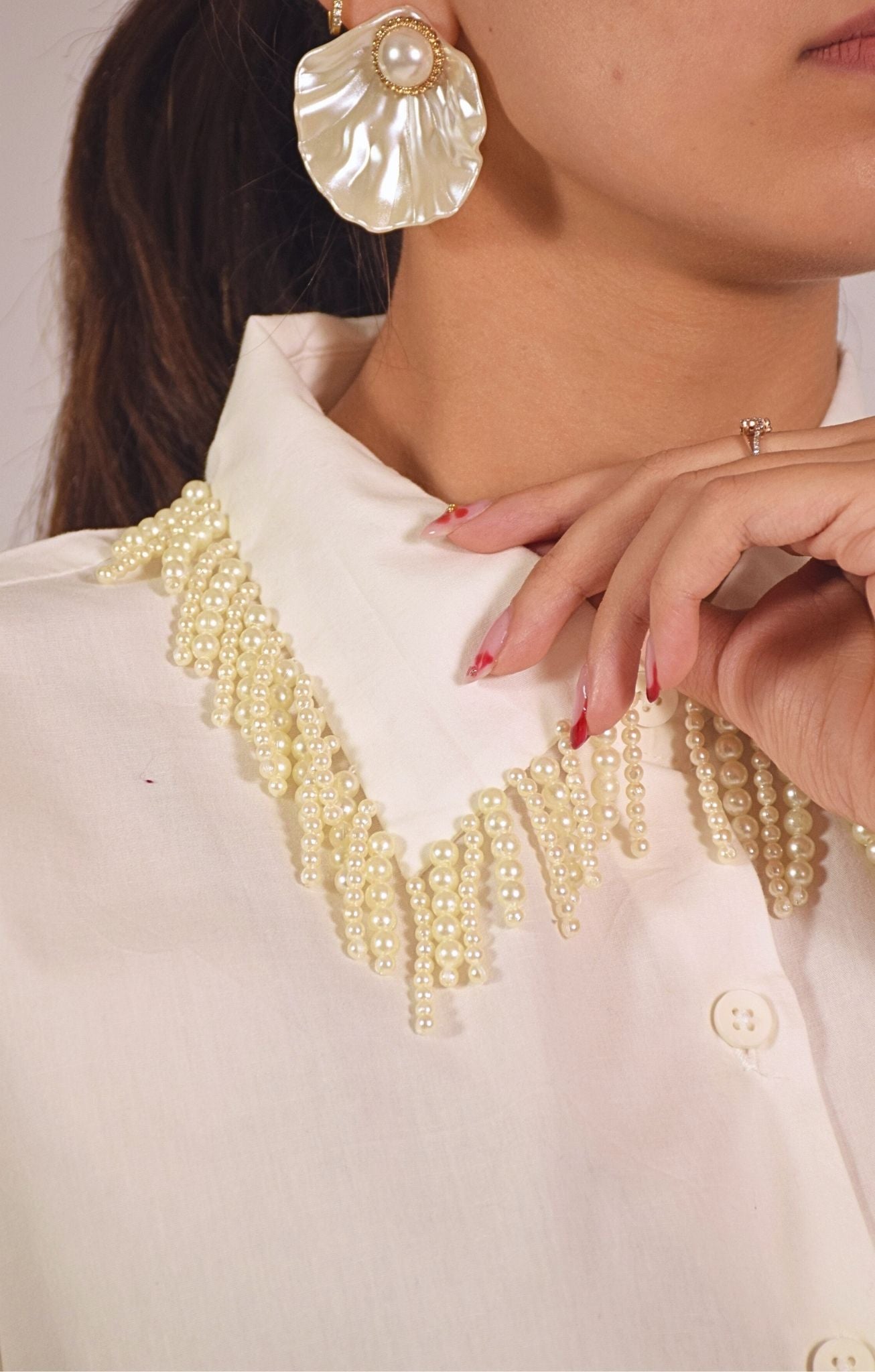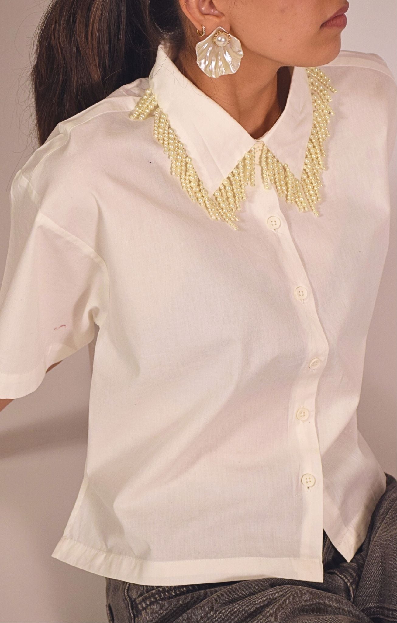 The Pearl Fringe Collar Shirt is a crisp short-sleeve essential elevated with a cascading collar of delicately hand-strung pearls, giving it a bold yet refined character. Designed for the woman who values detail, this shirt fuses minimal tailoring with maximal embellishment.