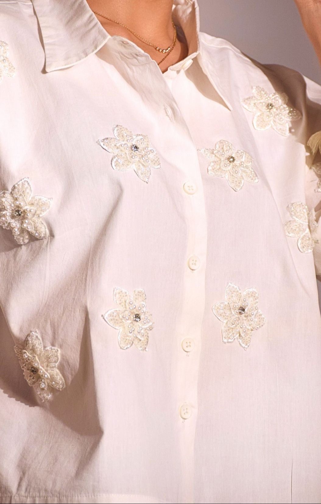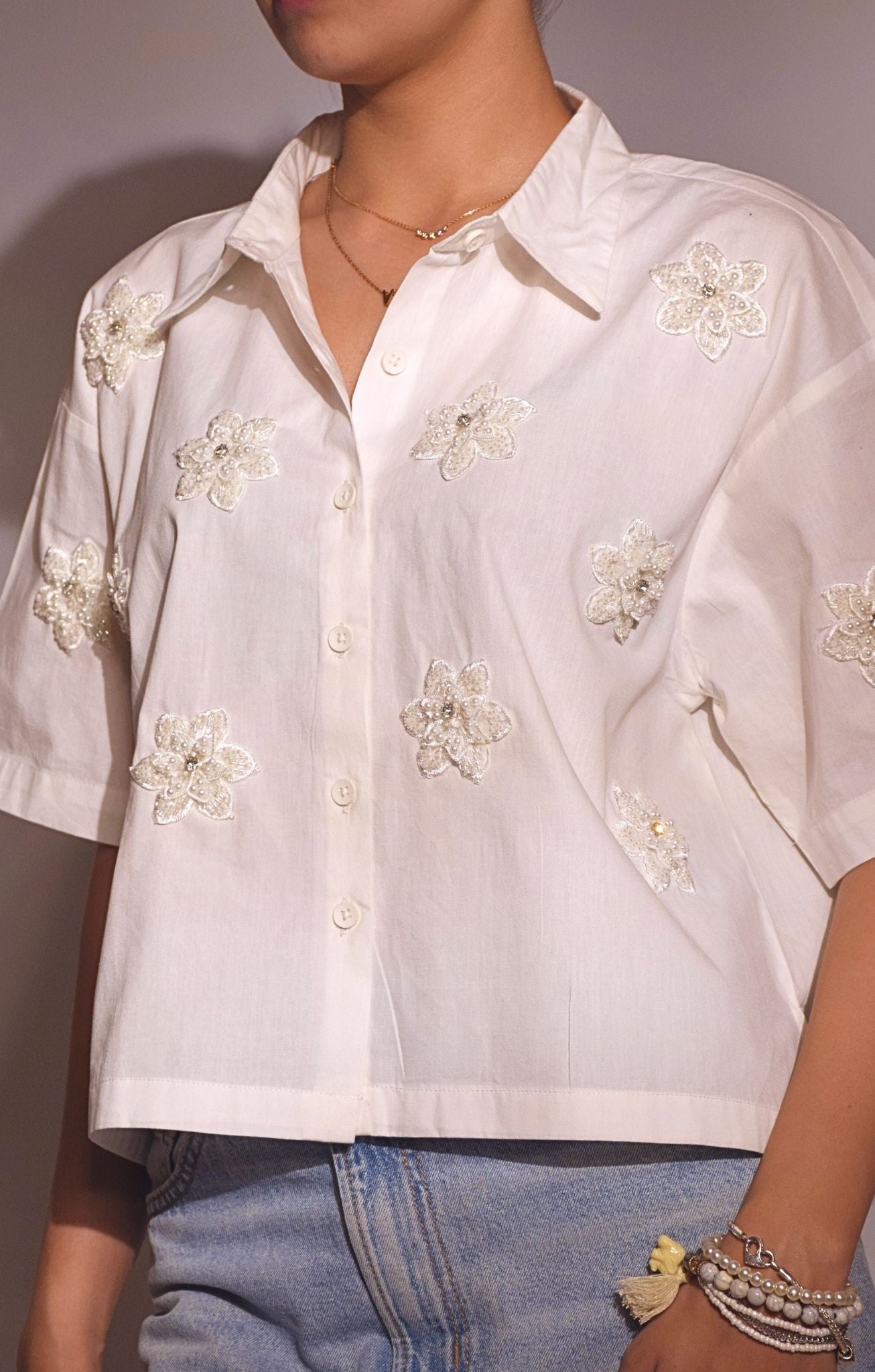 Pearl Flower Embellished Handcrafted Crop Shirt