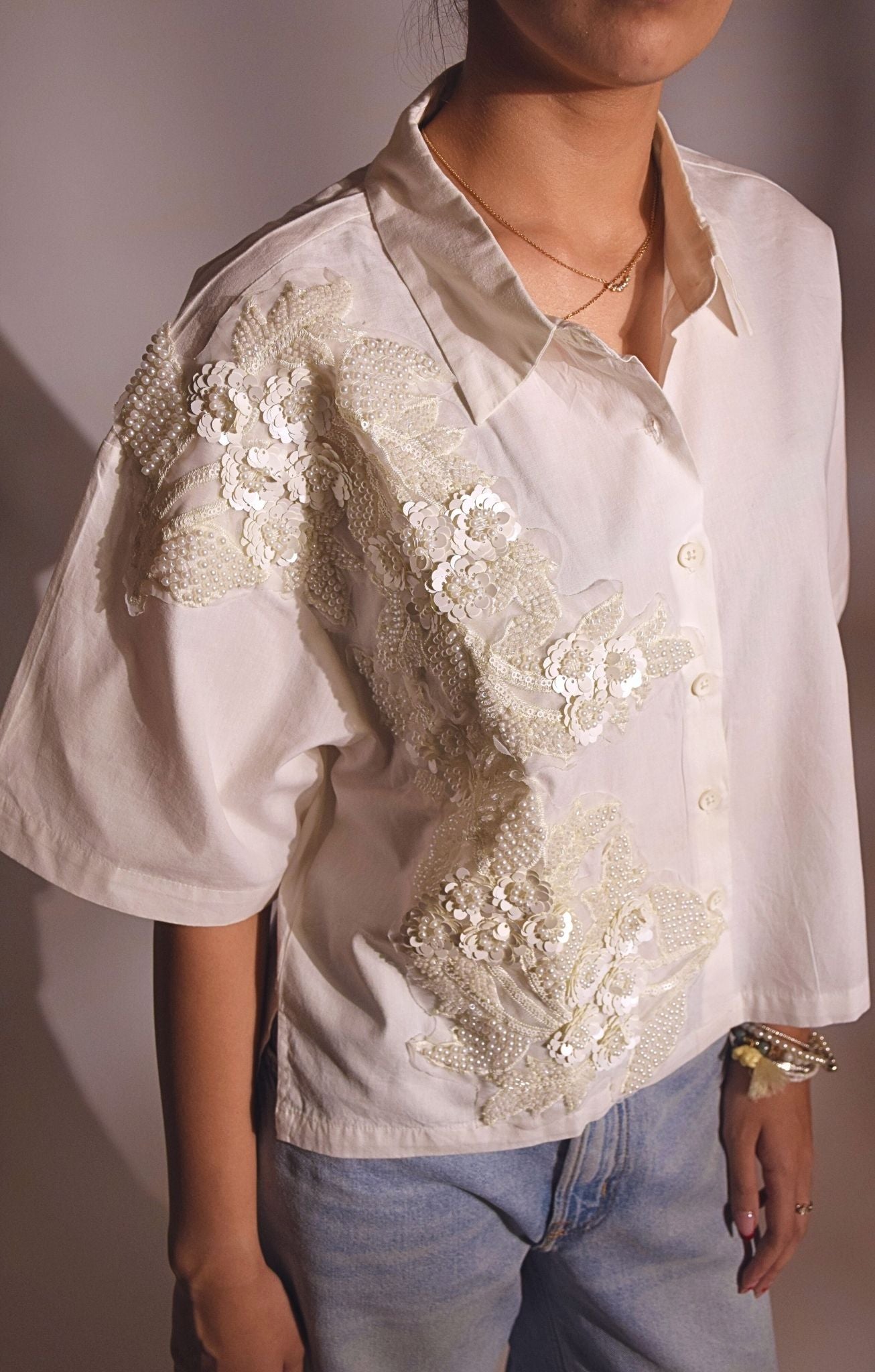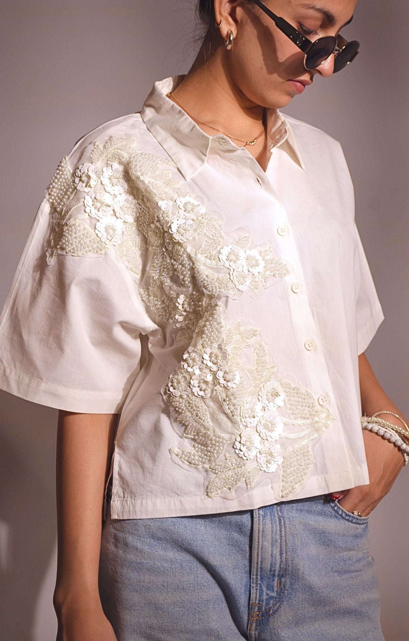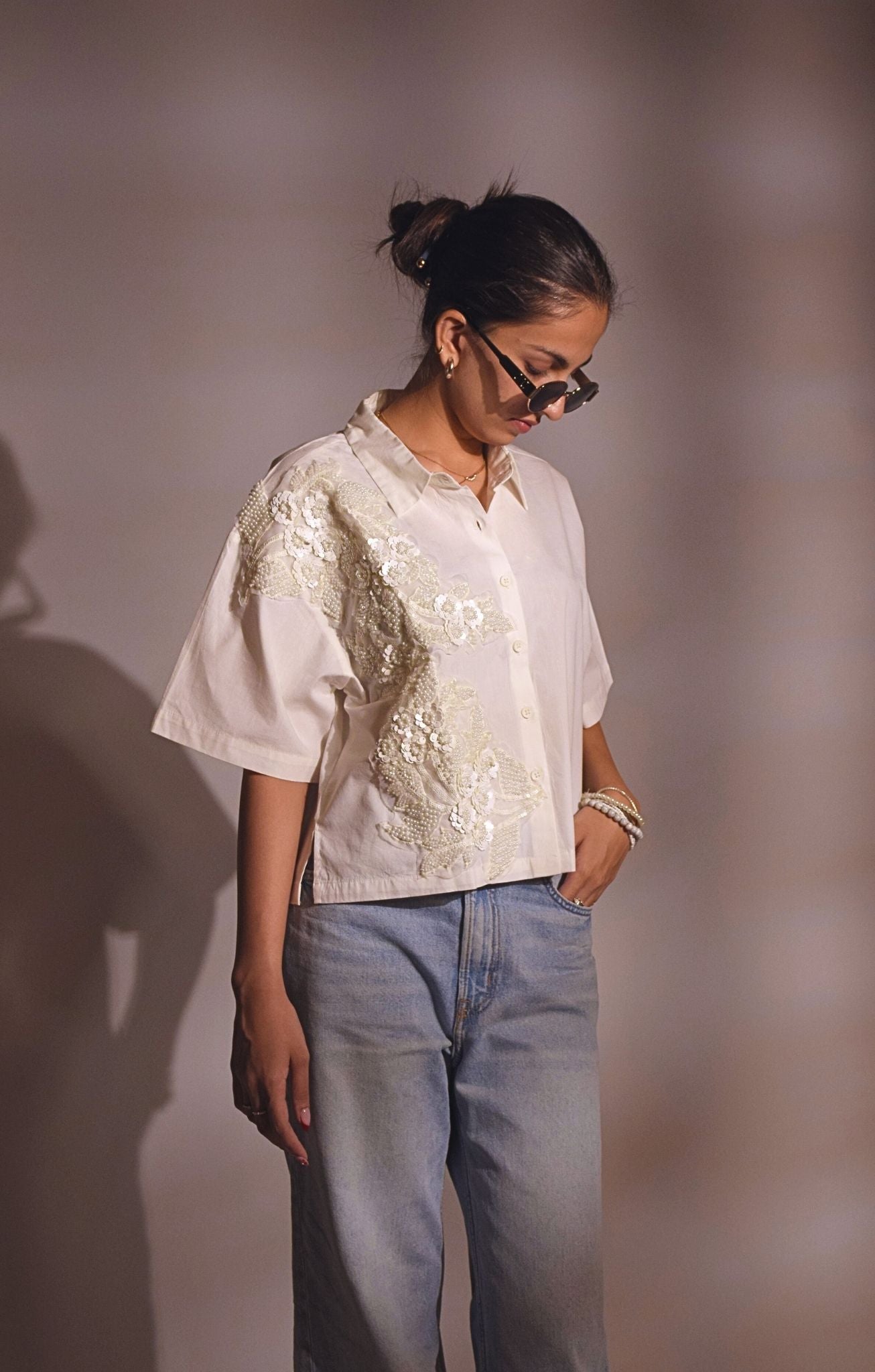 Elevate your wardrobe with this elegant white short-sleeve shirt, featuring a relaxed, boxy fit for effortless style and comfort. Intricately adorned with floral lace appliqué, shimmering sequins, and delicate pearl beadwork, this shirt brings a refined yet contemporary edge to everyday dressing. The soft cotton fabric ensures breathability, while the classic collared neckline and button-down front make it a versatile piece for both casual and semi-formal occasions. Pair it with your favorite denim for a chic, laid-back look.