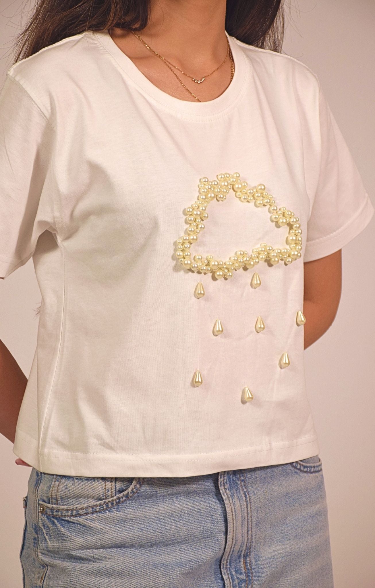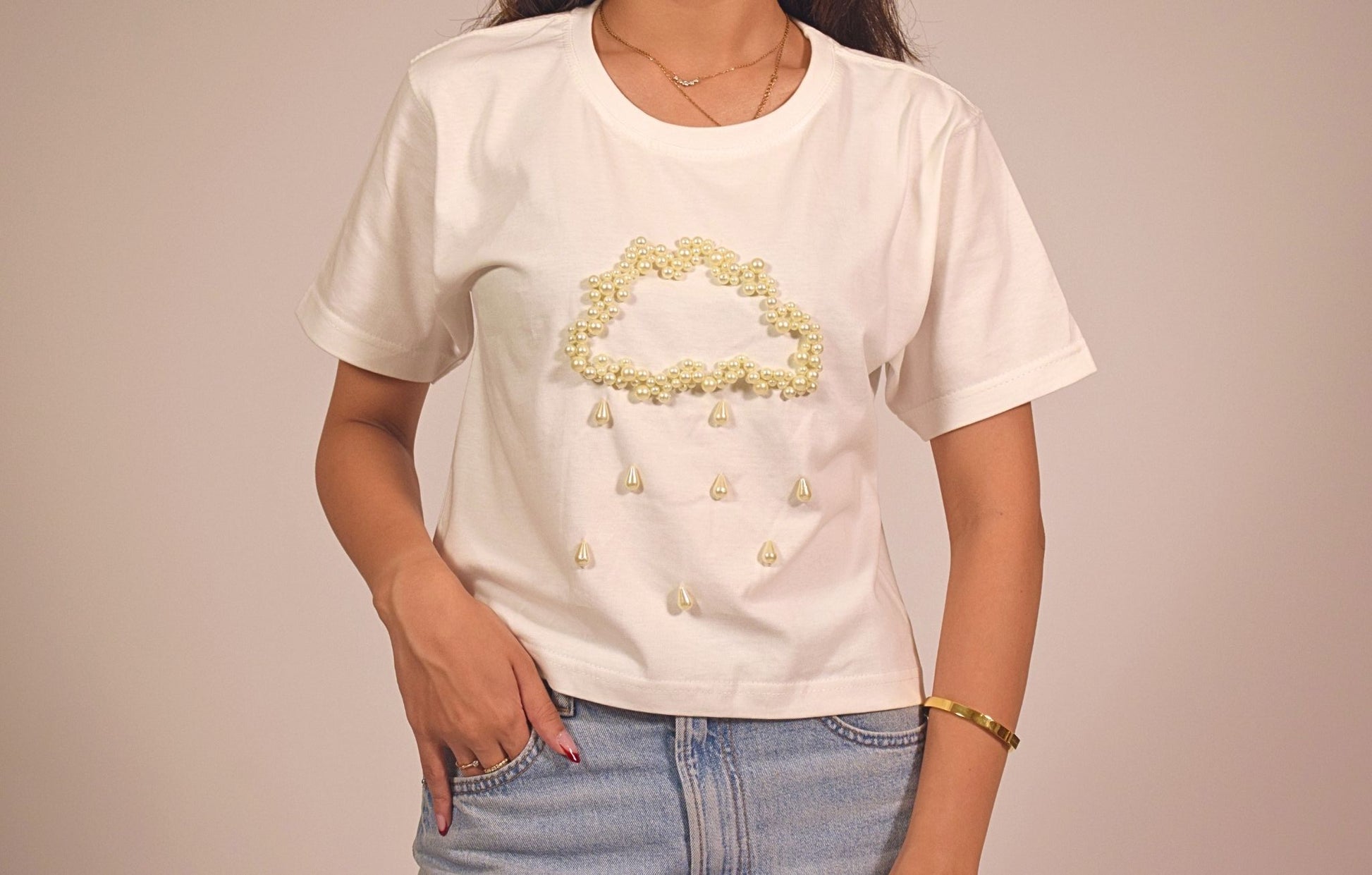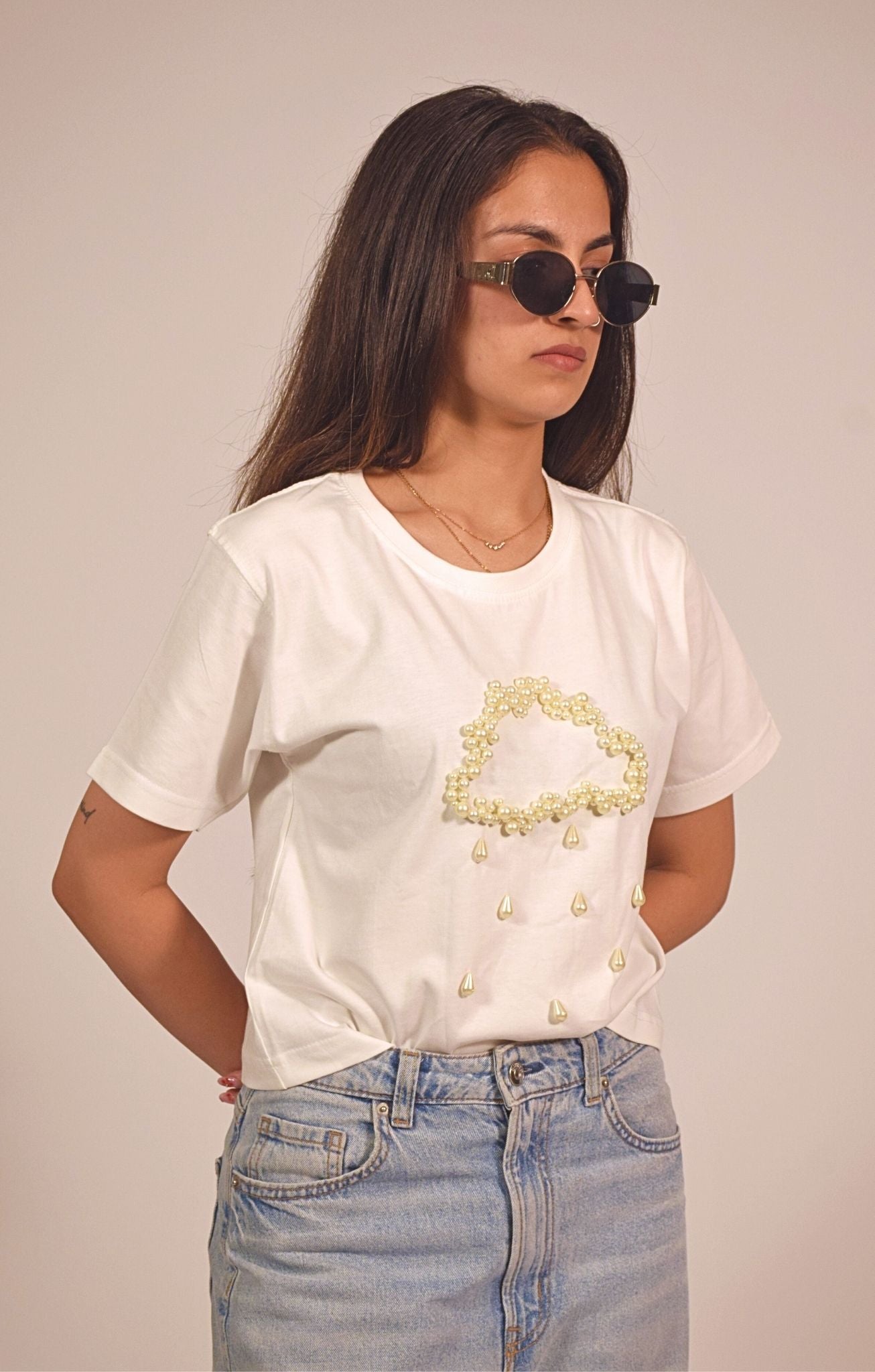 Let the T-shirt shine by pairing it with charcoal jeans or a monochrome skirt. For an elevated street-style look, throw on a cropped denim jacket, minimal sneakers, and a bold lip. Add layered rings or a single cuff bracelet to complement the pearl detailing.