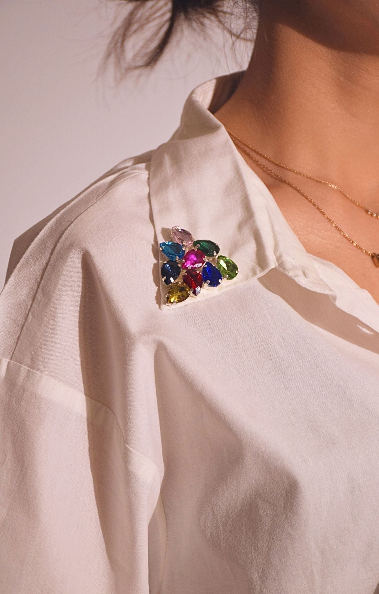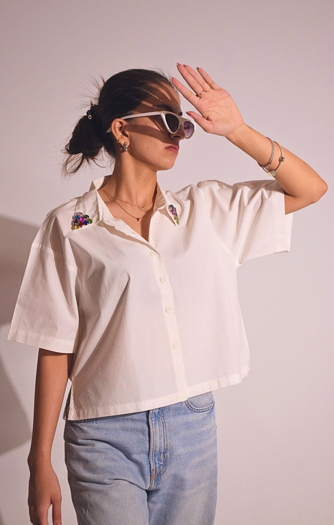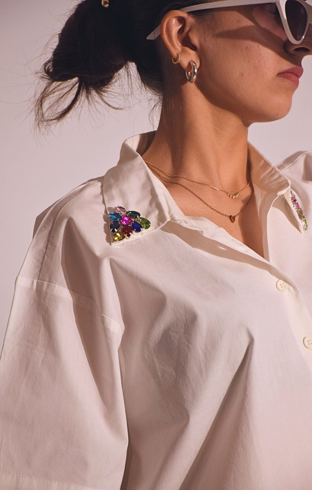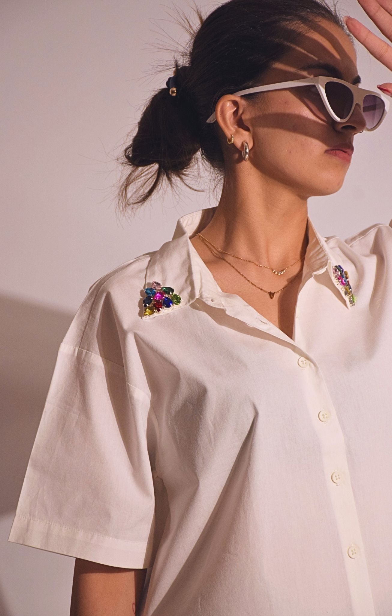 Step into statement style with this crisp white short-sleeve shirt, elevated by vibrant gemstone embellishments on the collar. Designed for a relaxed yet polished look, this shirt features a clean button-down front and a soft, structured cotton fabric that offers all-day comfort. The multicolored gem clusters at each collar tip add a playful touch of glamour, making it perfect for casual chic ensembles or dressing up a laid-back outfit.