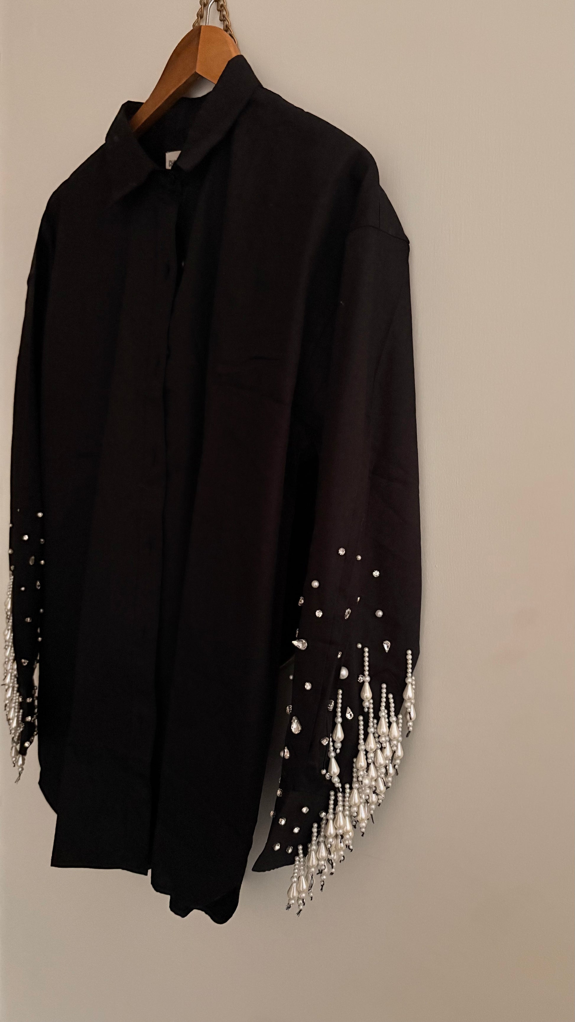 What sets this shirt apart is its hanging pearls detailing gracefully cascading across the cuffs adding a bold, fashion-forward twist. Whether you're styling it with tailored trousers for a power look or denim for casual glam, this shirt delivers instant sophistication and standout style.